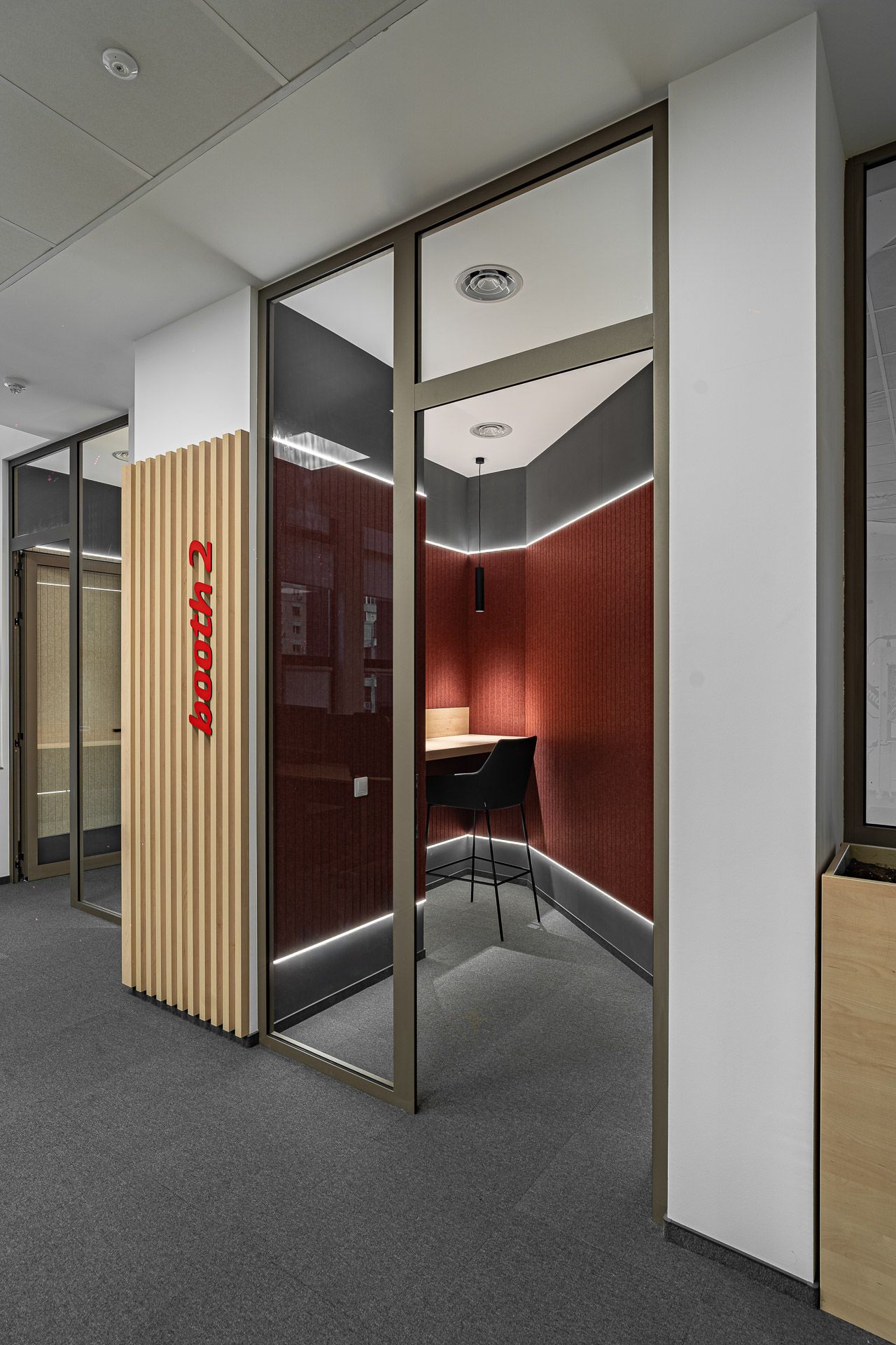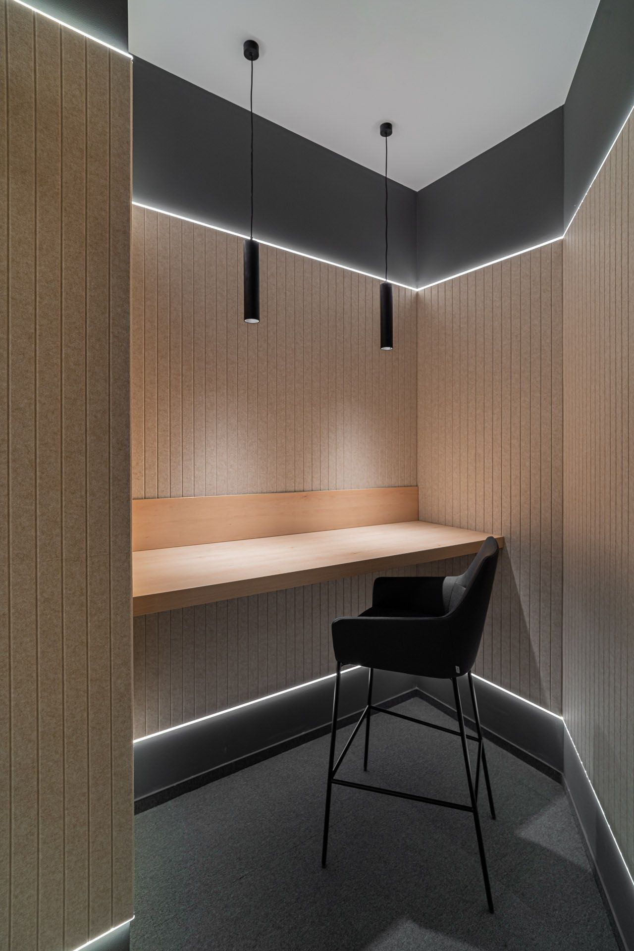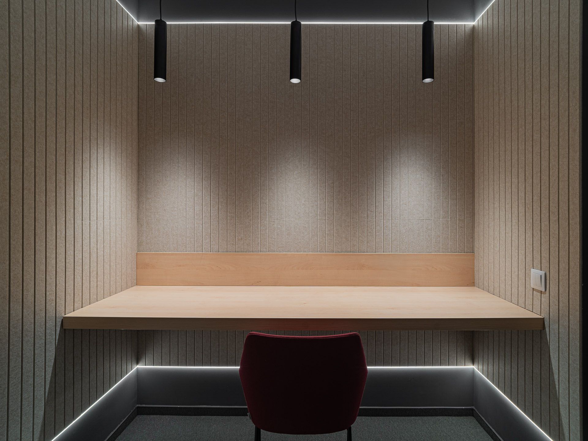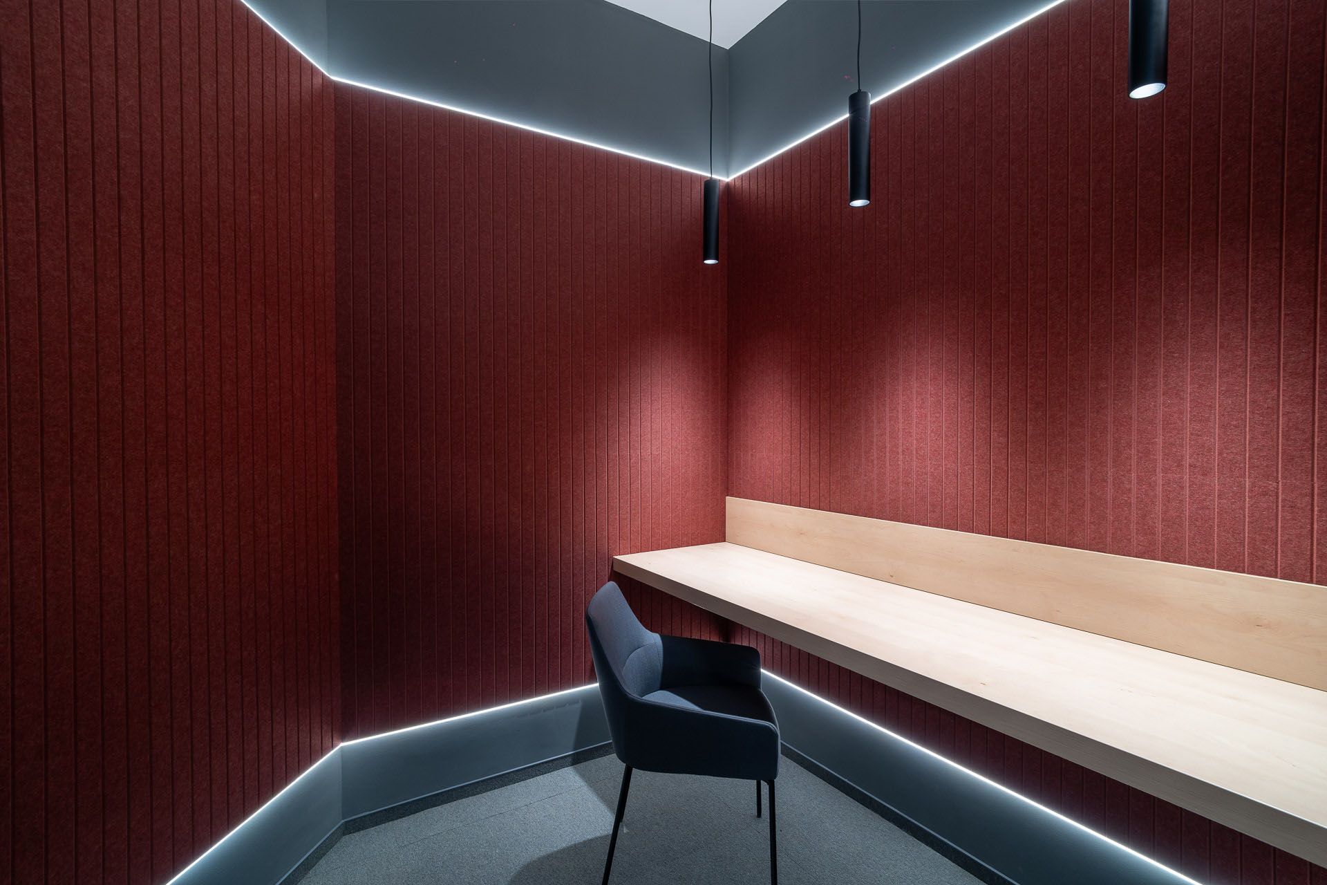 In de focusruimtes zijn onze Slats PET Felt Panelen geplaatst in de kleuren beige en wine. Deze panelen verbeteren de akoestiek en voegen tegelijkertijd visuele diepte toe. De geïntegreerde LED-strips zorgen voor subtiele verlichting, waardoor er een rustige werkplek ontstaat die concentratie ondersteunt.