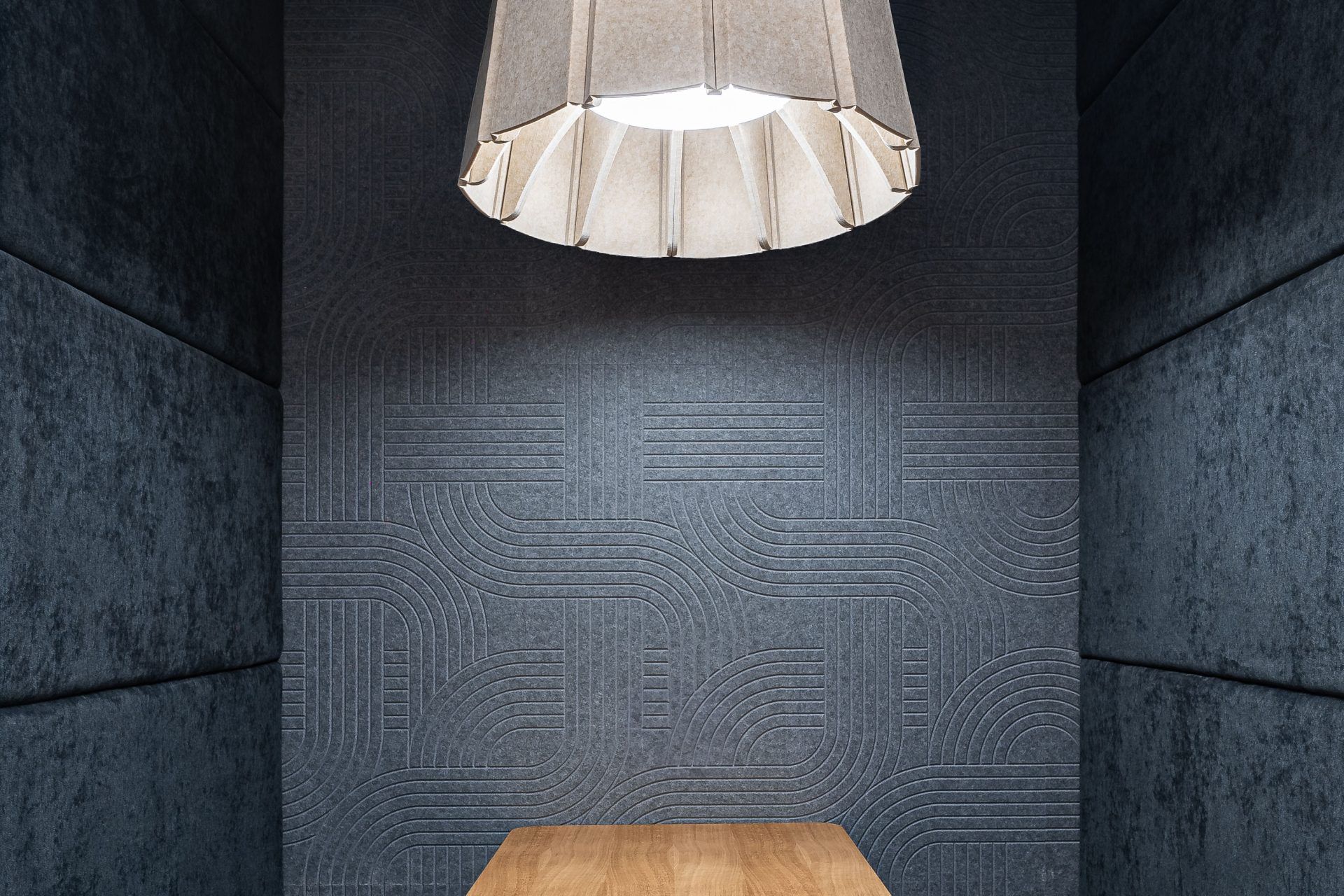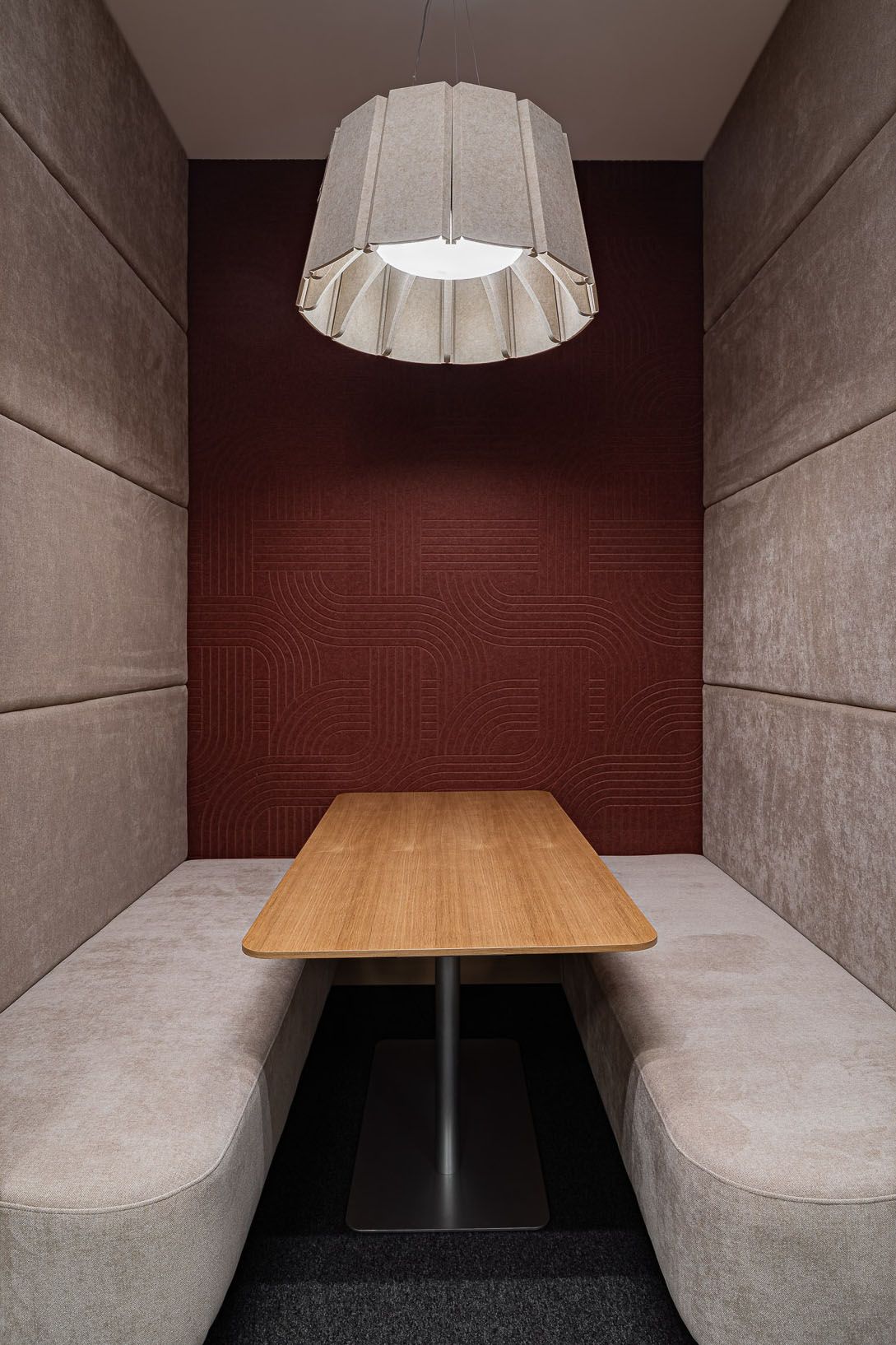 Op andere plekken in het kantoor zijn Streets V-cut Akoestische Panelen gebruikt in beige, wine en light grey. Ze bekleden de wanden van de zitnissen en dragen bij aan een prettige geluidsomgeving en een karakteristieke uitstraling. In combinatie met de beige Aster Akoestische Lamp Medium ontstaat een gebalanceerd geheel van verlichting en geluidsdemping. Het resultaat is een werkomgeving die is ontworpen met oog voor zowel functionaliteit als sfeer, en die verschillende werkvormen ondersteunt.