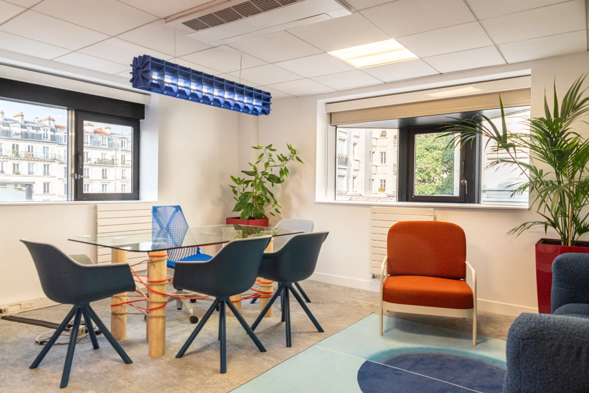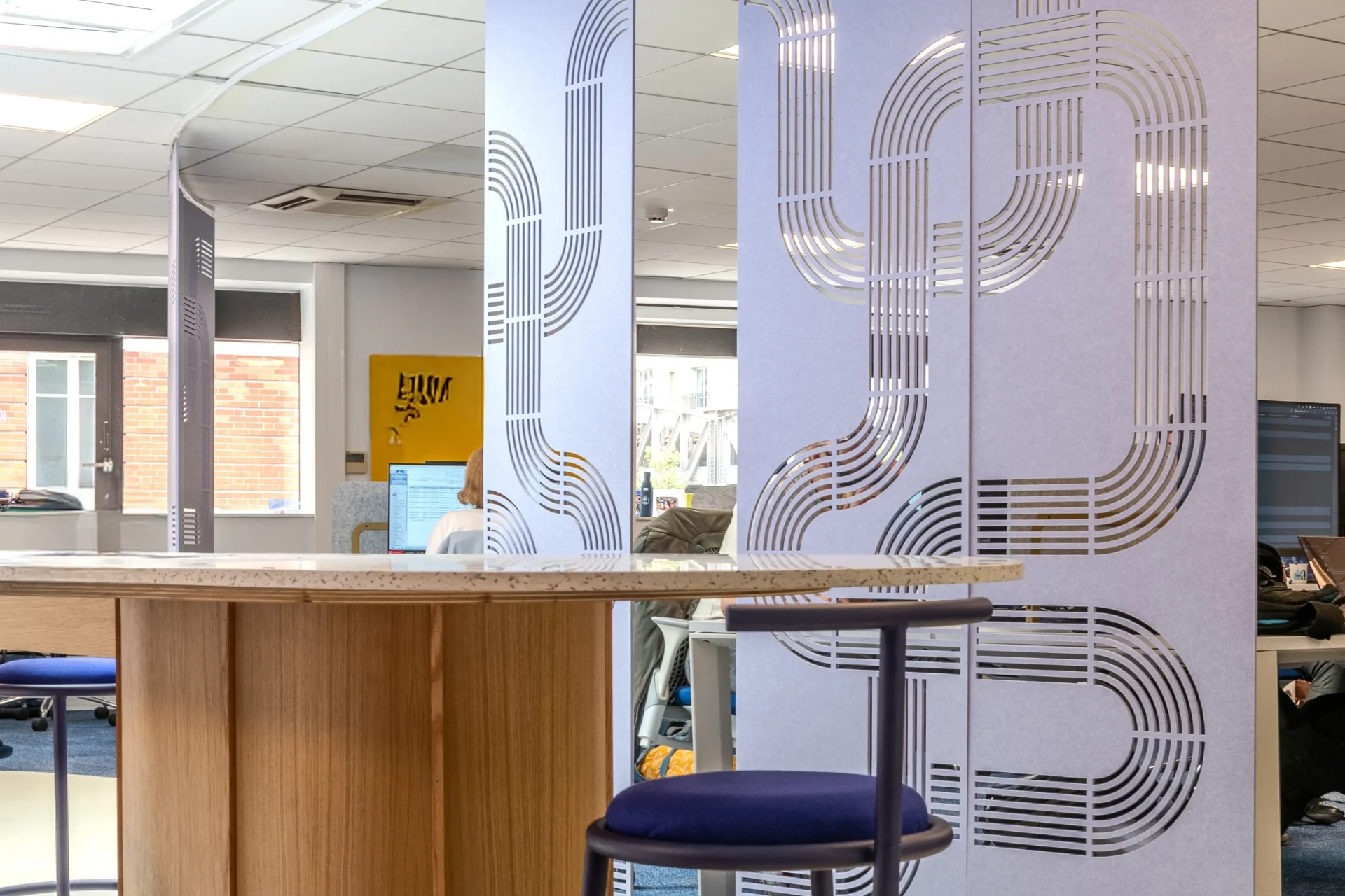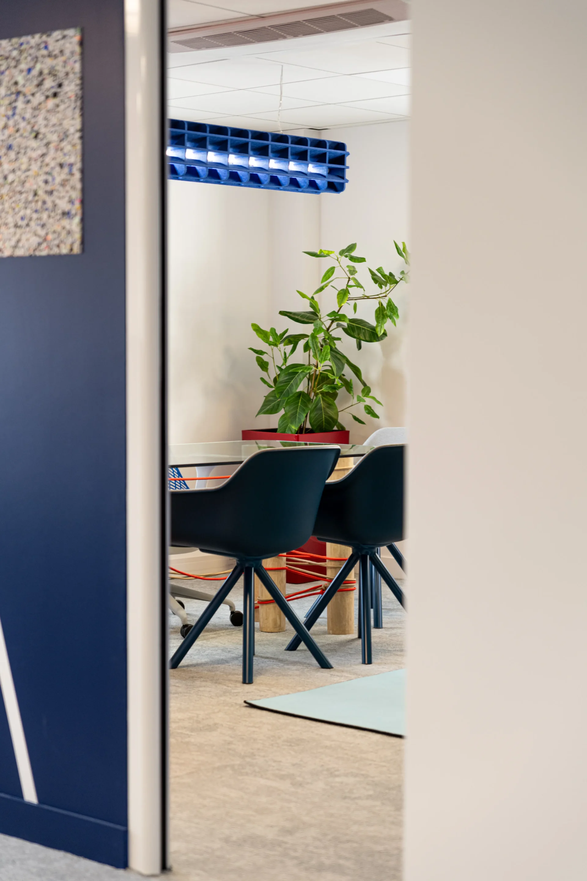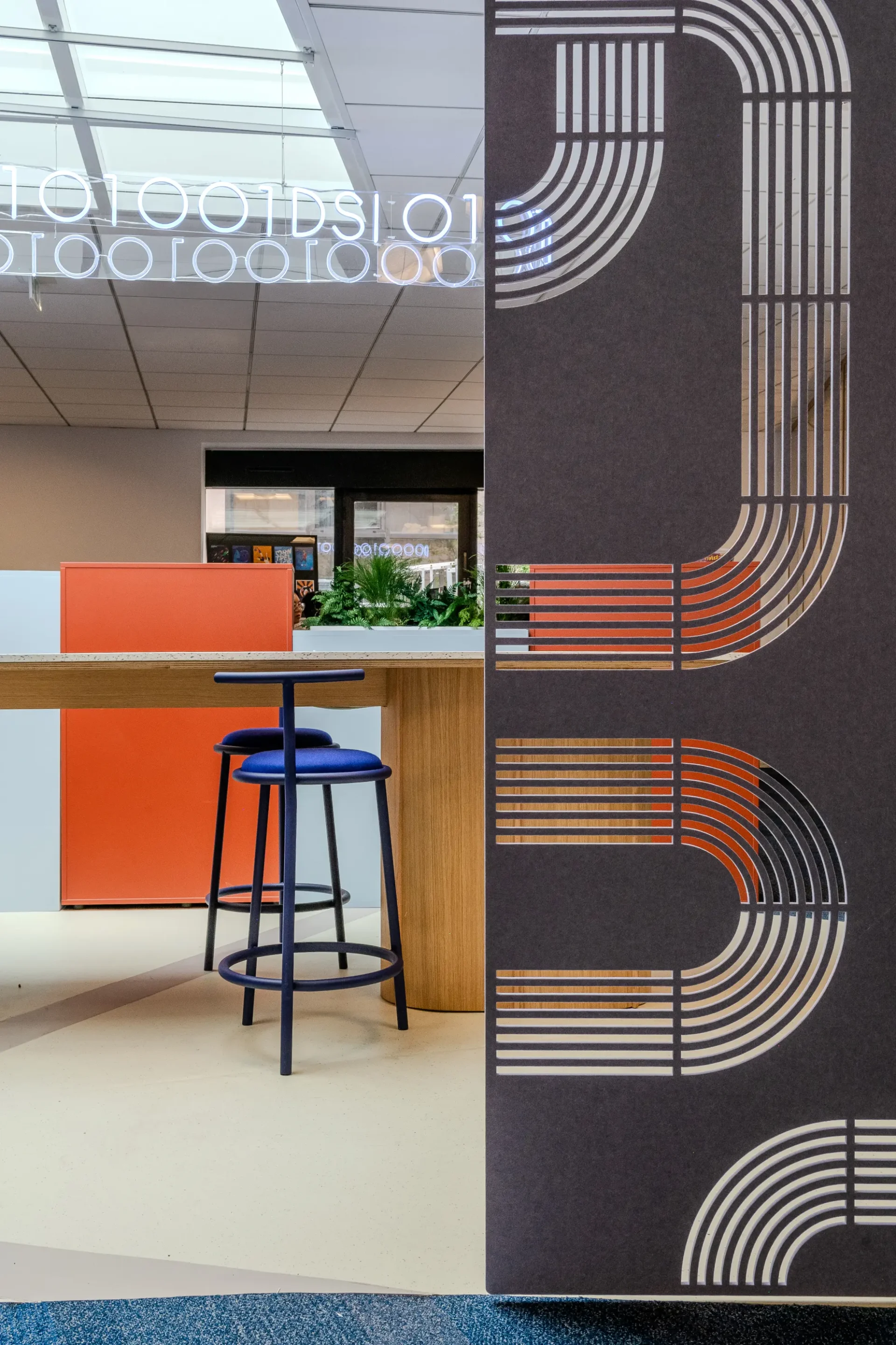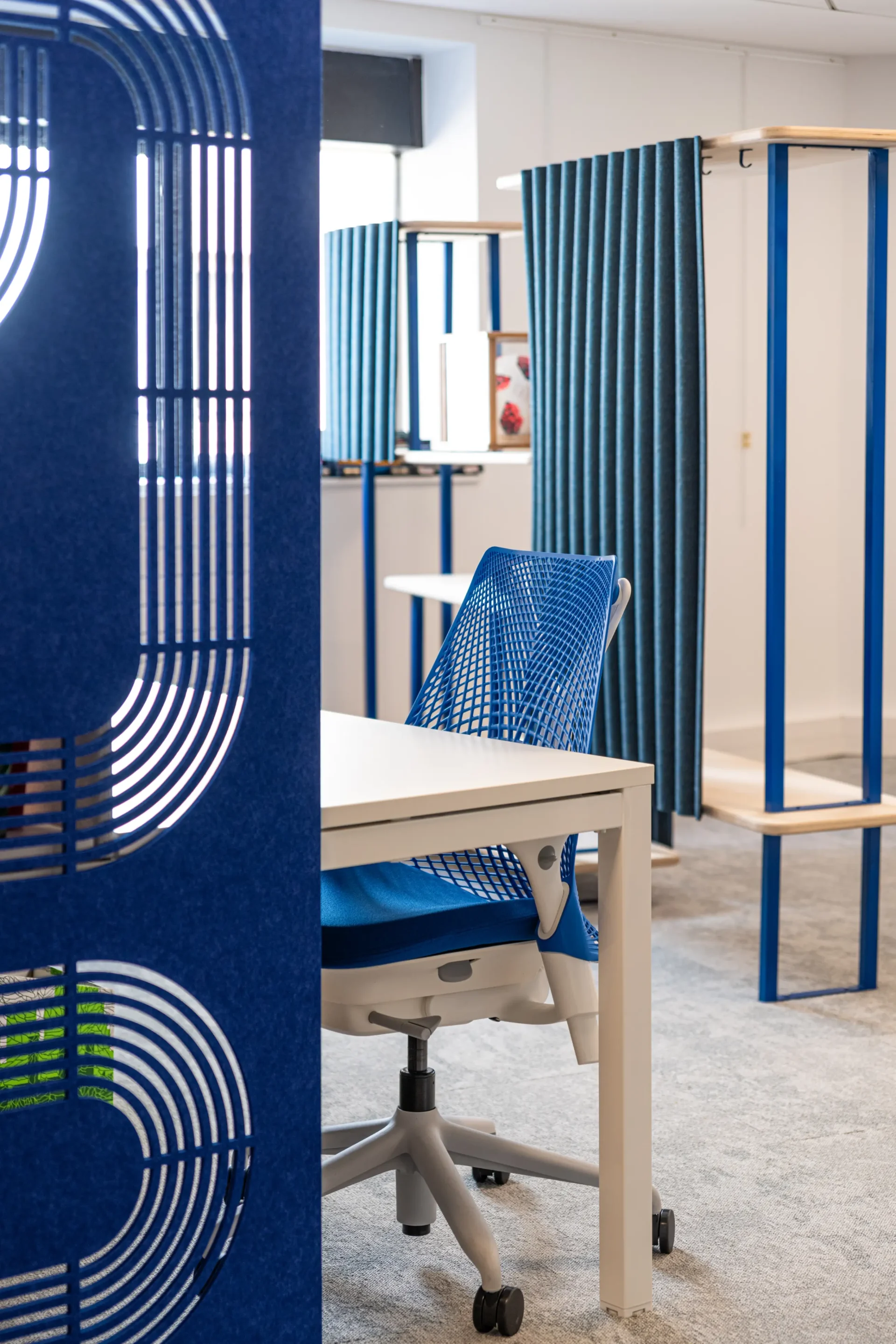 Door het hele interieur zijn subtiele verwijzingen naar de voetbalwereld verwerkt. Speelse elementen zoals oversized sportballen, netstructuren en dynamische wandrekken brengen beweging en lichtheid in het ontwerp, als een knipoog naar de beleving van het spel. Onze Streets PET Felt Hanging Dividers structureren de open ruimtes, verbeteren de akoestiek en brengen een rustige, grafische lijn in het geheel. In de vergaderruimtes zorgen onze Radial PET Felt Pendant Lamps voor visuele samenhang en akoestisch comfort, en dragen zo bij aan een geconcentreerde maar toegankelijke sfeer.