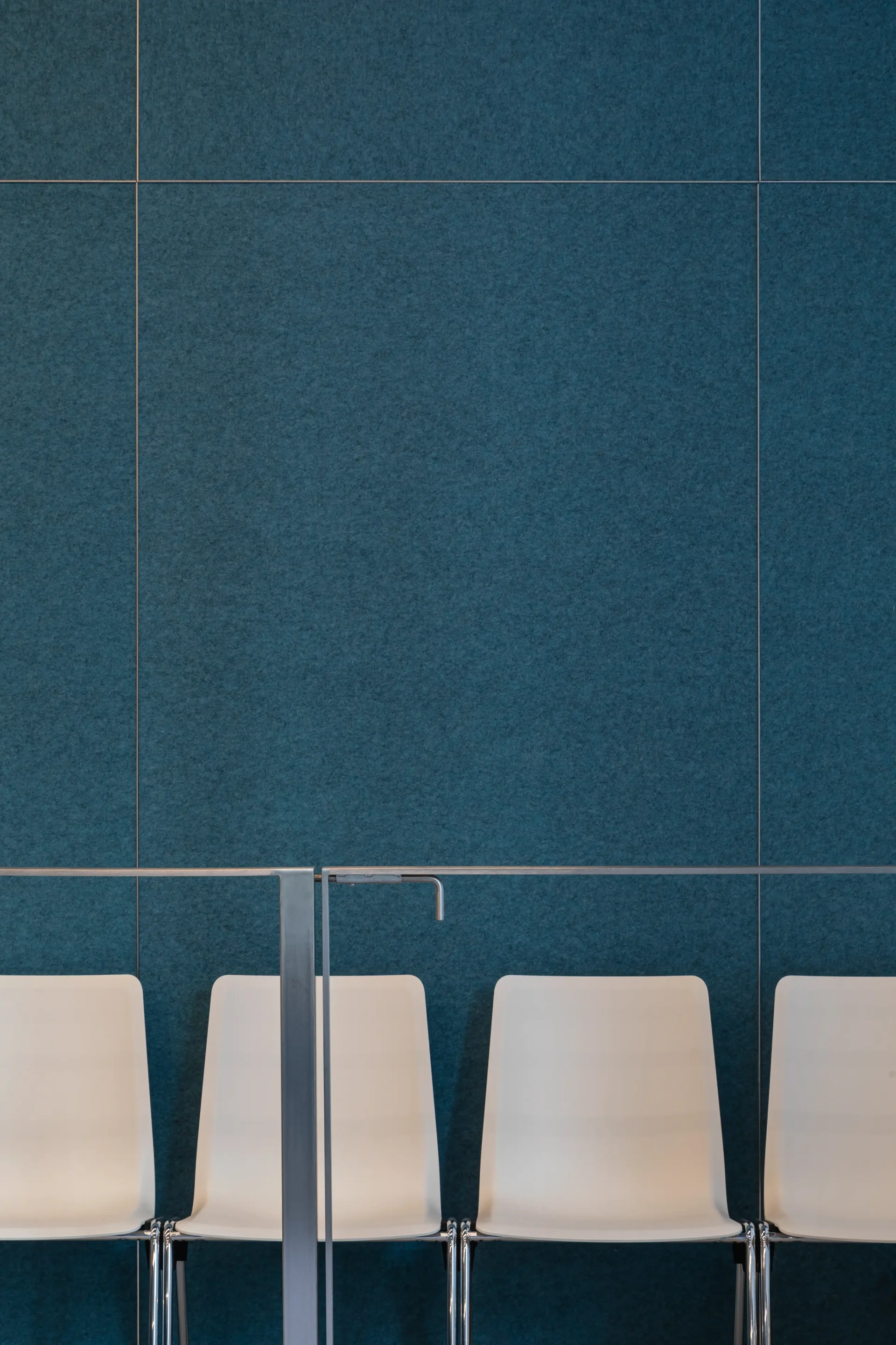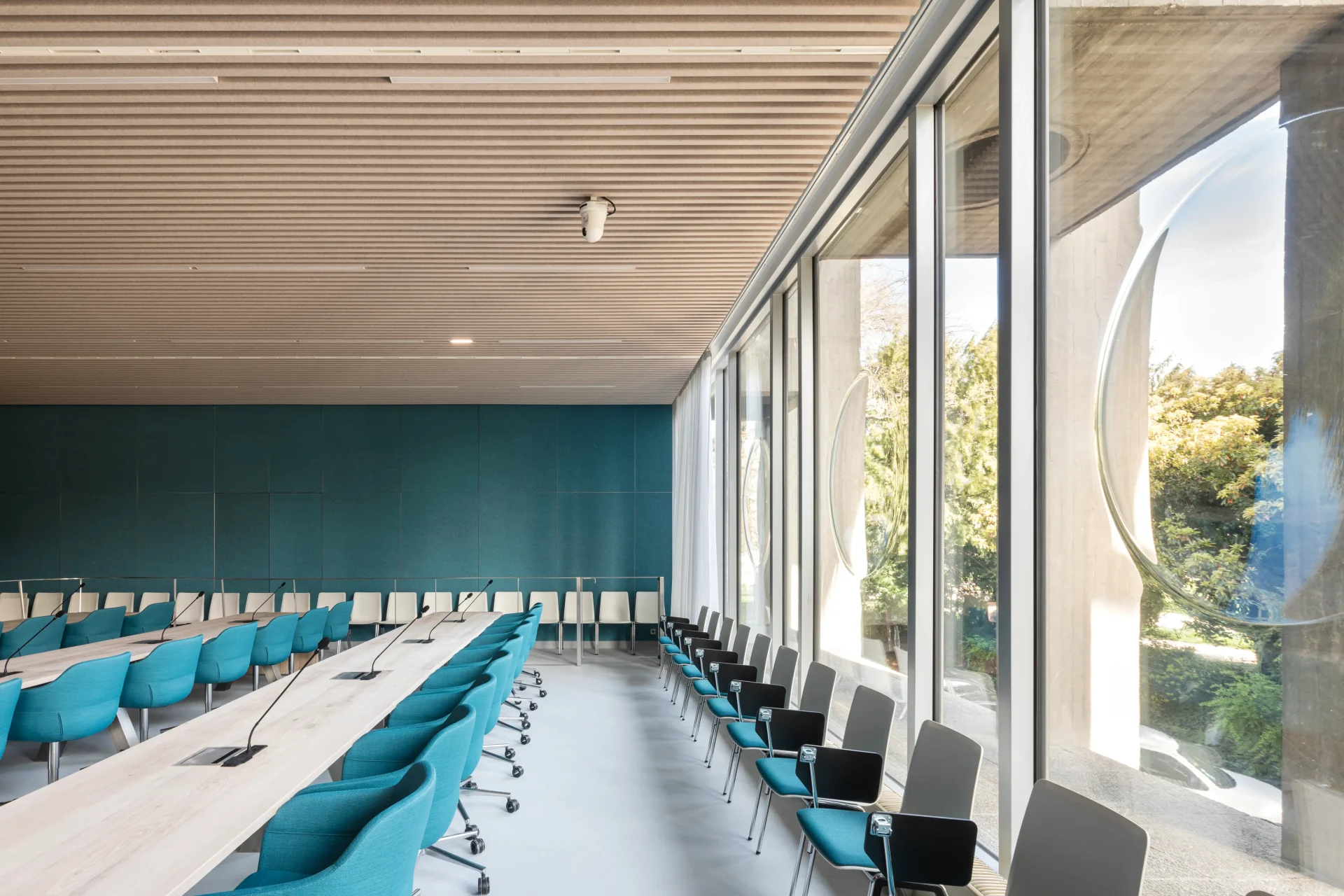 Het stadhuis van Grenoble, een modern architectonisch project, is voorzien van onze Melange PET Felt panelen in de kleur Ocean. De grote vergaderruimte, gevuld met deze panelen, biedt een rustige en professionele sfeer. De panelen bekleden de muren en voegen een oceaanblauwe tint toe aan de ruimte, die contrasteert met het lichte houten meubilair en de grote ramen die natuurlijk licht binnenlaten. Deze ruimte heeft niet alleen sterke visuele uitstraling, maar draagt ook bij aan het akoestisch comfort, waardoor het een geschikte omgeving is voor belangrijke discussies en vergaderingen.