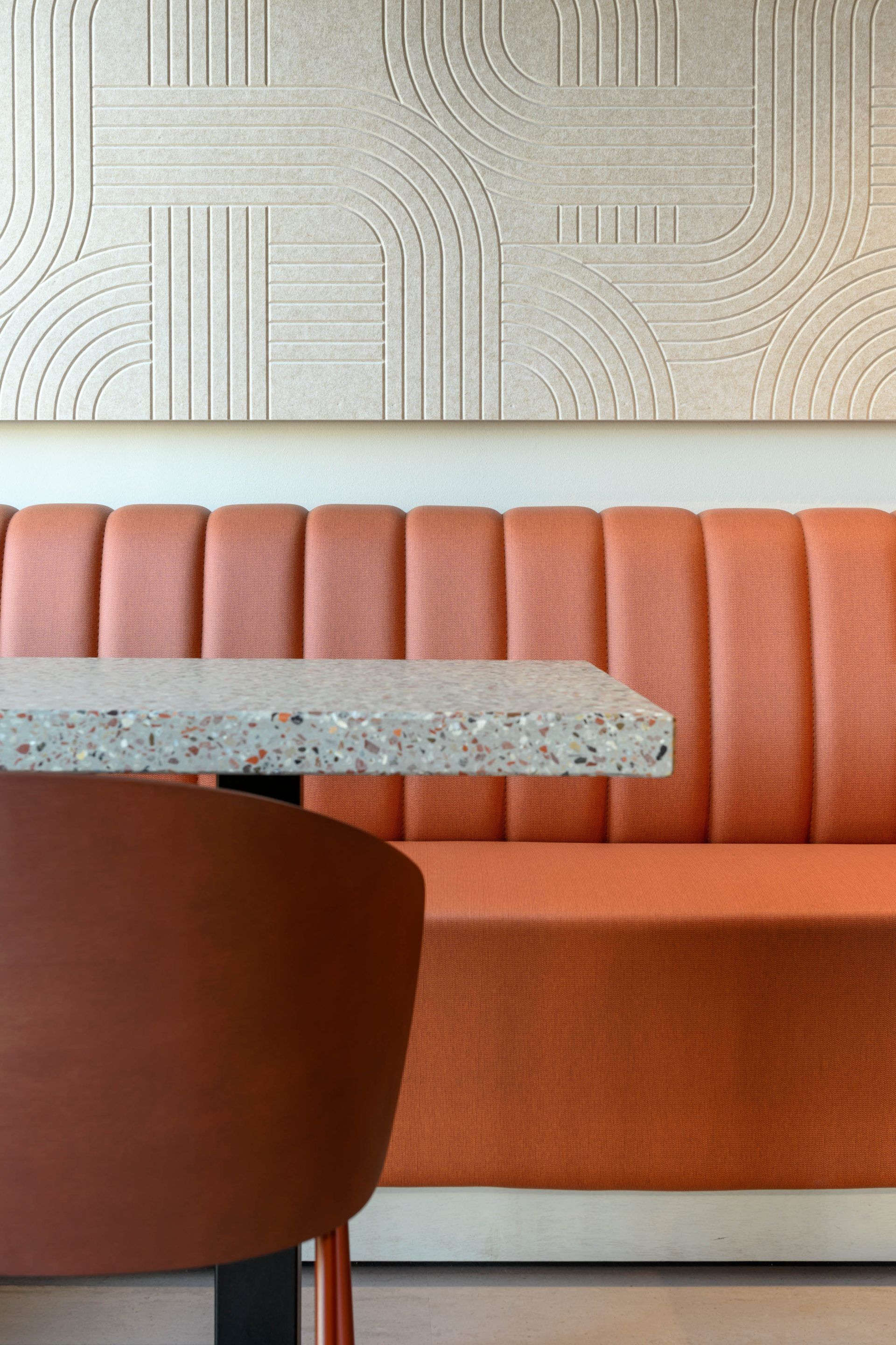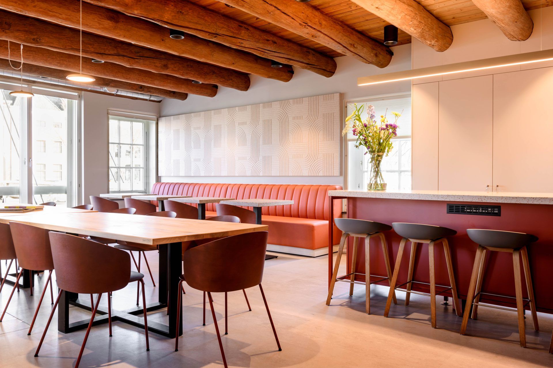 De begane grond is nu ingericht als een levendige ontmoetingsplek, waar samenwerking centraal staat. Een gedeeld café en vergaderruimtes vloeien open in elkaar over en nodigen uit tot verbinding en uitwisseling. Boven de zitplek aan de wand zijn beige Streets V-Cut akoestische panelen geplaatst—subtiel, maar met een uitgesproken vormtaal die zowel textuur als akoestisch comfort toevoegt. Gemaakt van gerecyclede PET-flessen onderstrepen de panelen het verhaal van vernieuwing dat door de hele renovatie heen voelbaar is.