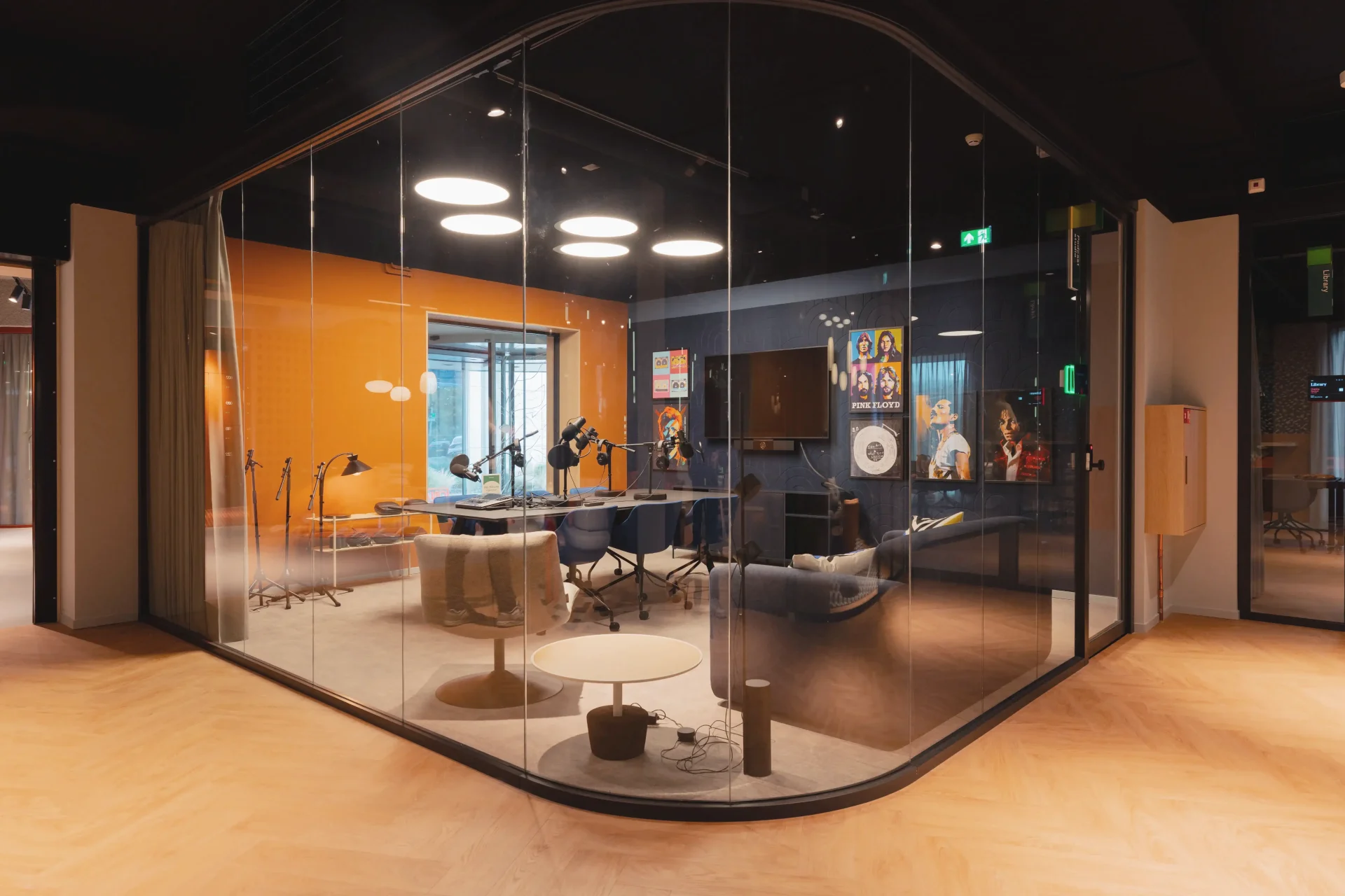 De podcast studio in HNK Amsterdam Sloterdijk is uitgerust voor hedendaagse digitale communicatiebehoeften, met faciliteiten die opnames ondersteunen voor groepen tot vier personen. Veelzijdig in zijn opzet, biedt de studio opnamemogelijkheden aan zowel een tafel als in een meer informele lounge setting, compleet met een visueel scherm voor interactieve ervaringen. De integratie van ReFelt’s Rainbow PET Felt Akoestische Panelen is een aanvulling op de ruimte, die de geluidskwaliteit verbetert voor een effectievere en aangenamere auditieve omgeving.