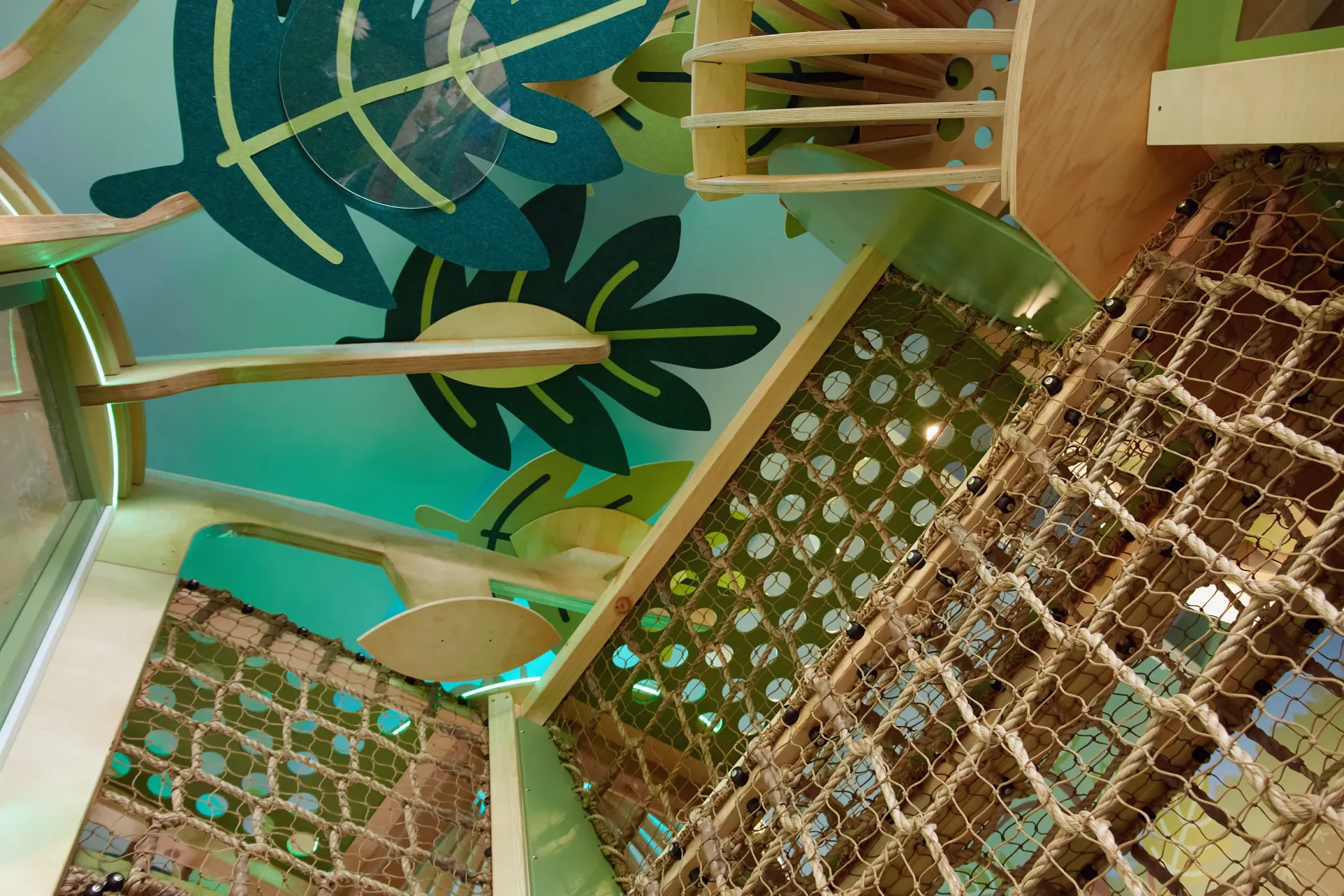 Een opvallend element is het bladerdak van oversized vilten bladeren boven de centrale speelstructuur. Deze zijn uitgesneden uit PET felt panelen in Lime en Dark Green, elk blad gevormd om aan te sluiten bij de speelse, organische vormen van het ontwerp. De op maat gemaakte onderdelen zijn nauwkeurig uitgesneden—wat zorgt voor een uniforme afwerking, strakke randen en een soepele montage op locatie. Deze maatwerkdetails geven de speelruimte een krachtige visuele identiteit en versterken het natuurlijke thema dat als rode draad door het project loopt, en verbinden het ontwerp met de buitenwereld die het weerspiegelt.