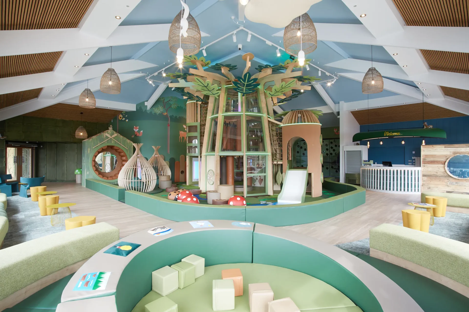 Tigerplay heeft in nauwe samenwerking met NBDA Architects een levendige en enerverende binnenspeelruimte gerealiseerd voor Hoburne Holiday Parks op hun locatie in de Cotswolds. De ruimte is ontworpen voor kinderen van 0 tot 8 jaar en brengt het ‘buiten naar binnen’-concept tot leven, geïnspireerd op de omliggende natuur en het uitzicht op het meer. Grote ramen omlijsten het landschap, terwijl het speellandschap zelf draait om twee centrale klimtorens, touwbruggen, een spiraal-glijbuis, een interactieve klimwand, lichteffecten met sensoren en een aparte zone voor baby’s. Het eindresultaat biedt een evenwichtige combinatie van visuele prikkeling, logische routing, veiligheid en speelwaarde—een omgeving die uitnodigt tot ontdekken, bewegen en fantasierijk spel.