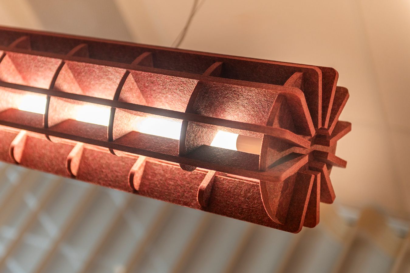 In de vergaderruimtes ondersteunt de verlichting in wijnrood de focus en zorgt voor een warme uitstraling. In een van de booths hangt de Aster PET Felt Acoustic Lamp Small, die zacht licht geeft en bijdraagt aan een stille omgeving. In een andere booth is gekozen voor de Radial Round PET Felt Pendant Lamp, die naast een goede akoestiek ook een duidelijk visueel accent toevoegt. Samen zorgen deze keuzes voor een rustige en evenwichtige werkomgeving.