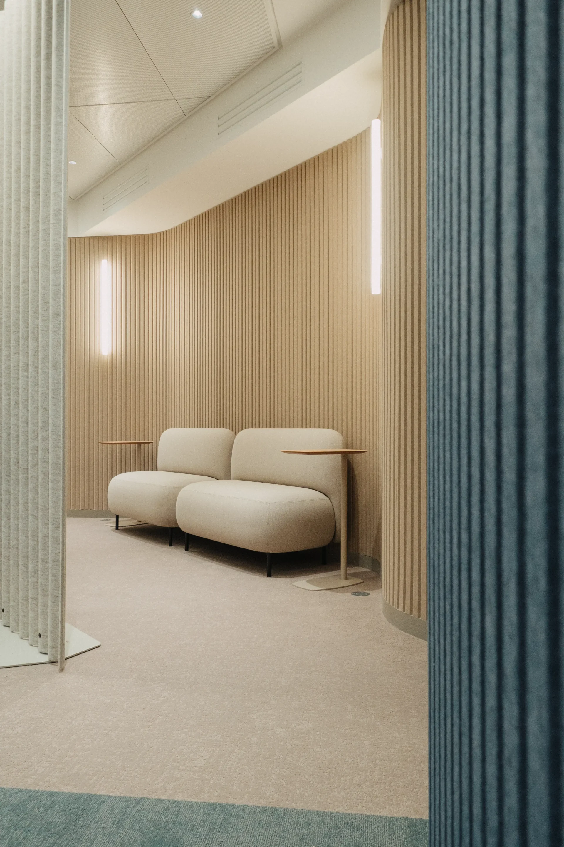 Deze akoestische PET felt panelen, die dankzij een V-vormig ontwerp de flexibiliteit bieden om rondingen te vormen die de ruimte definiëren. Deze panelen versterken niet alleen de esthetiek, maar dienen ook om geluid te dempen, waardoor een heldere en rustige communicatieruimte wordt gegarandeerd.