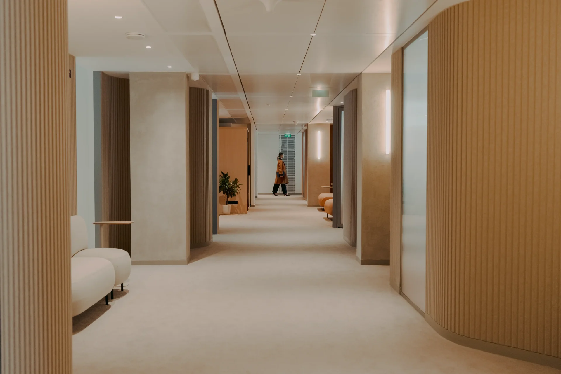 In Parijs heeft RF Studio het interieur van een consultancybureau geüpdatet, waarbij ze gebruik hebben gemaakt van een mix van modern design met effectieve akoestiek. De ruimte wordt gekenmerkt door een subtiele samenspel van verticale lijnen en een palet dat warme en koele tinten combineert, wat zorgt voor een ingetogen maar prettige sfeer. De PET felt materialen van ReFelt, gekozen vanwege hun aanpasbaarheid, dragen bij aan een werkomgeving die zowel de zintuigen als het milieu kalmeert, wat zorgt voor onverstoorde productiviteit.