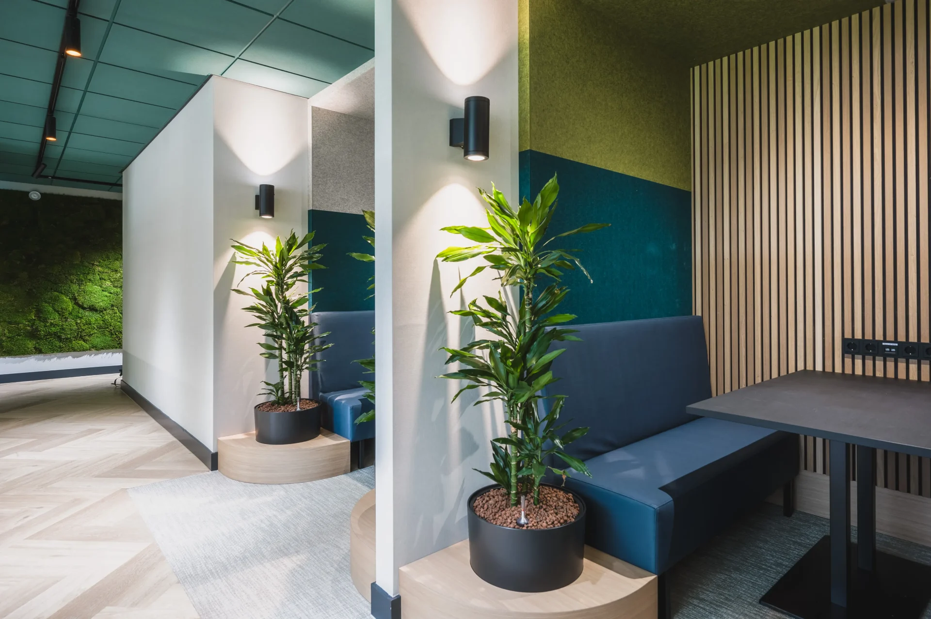 Verschillende tinten groen en het gebruik van houten wandpanelen en een mooie visgraatvloer zorgen voor rust en herkenning bij klanten, bezoekers en personeel. Details zoals zwarte tafelbladen en kasten geven de ruimtes van het hoofdkantoor een stoer accent. Interior Boost is erin geslaagd om met maatwerk en een diversiteit aan materialen en structuren een toegankelijke en verrassende uitstraling neer te zetten.