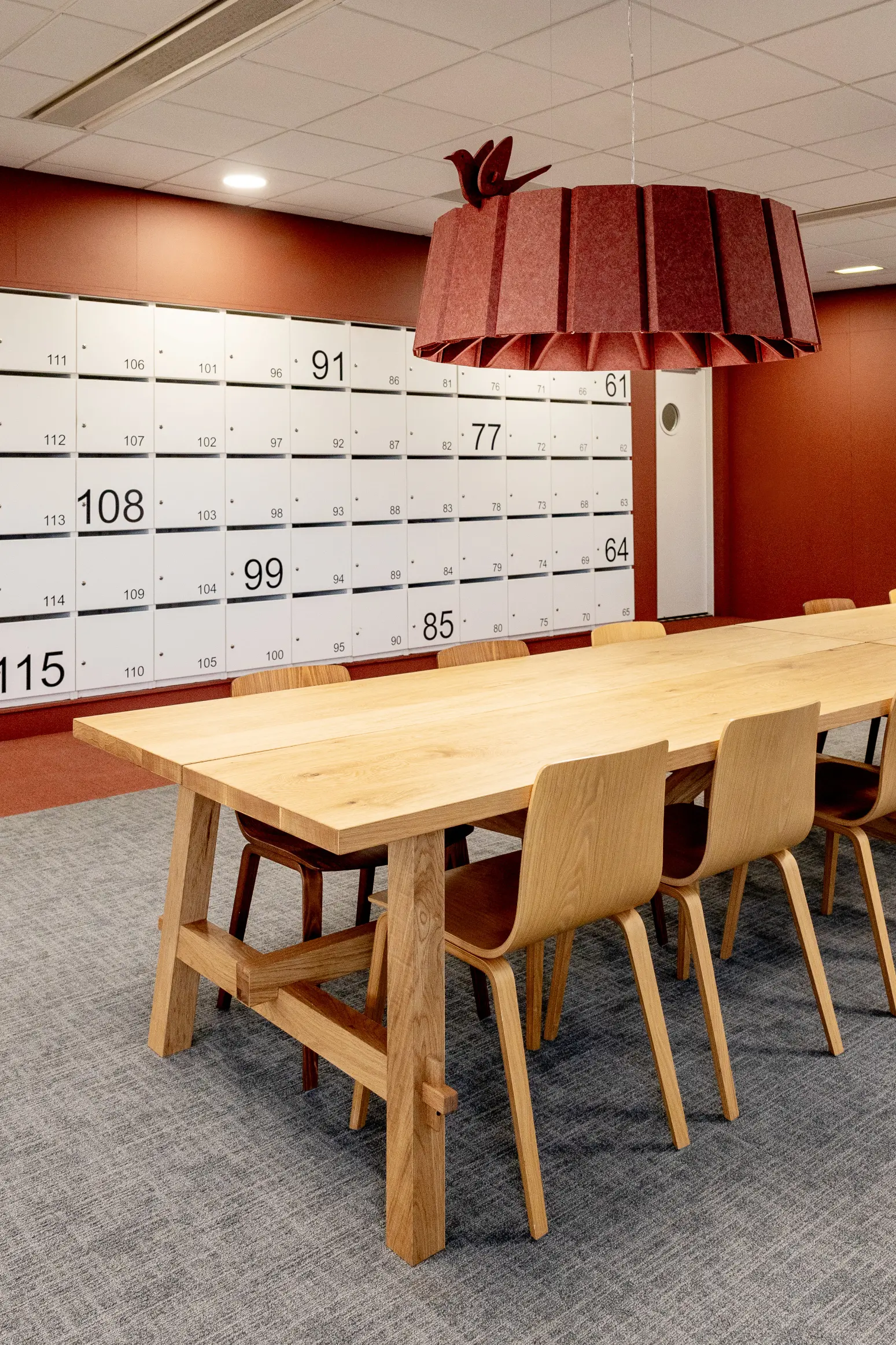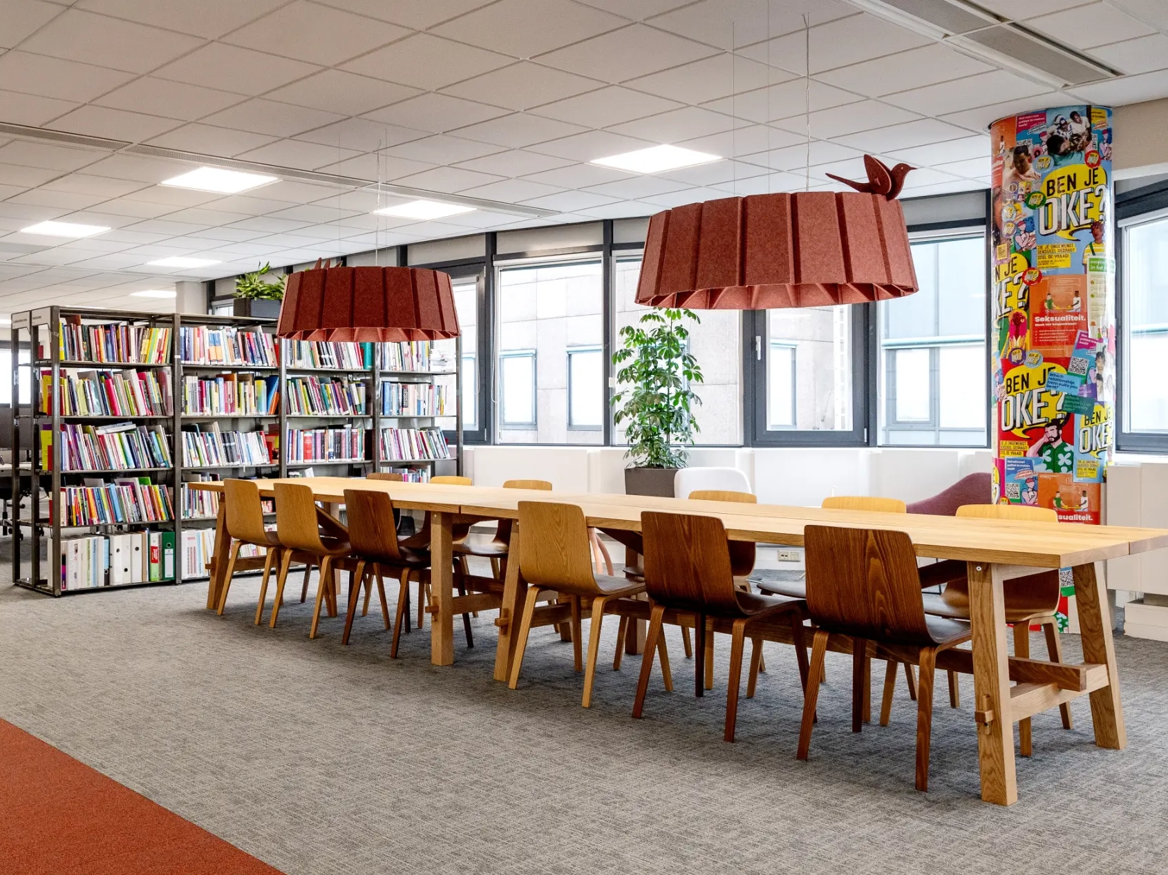 Het interieur is ingericht om verschillende werkvormen en interacties te ondersteunen. Grote gedeelde tafels nodigen uit tot samenwerking en informele overleggen. Boven deze tafels hangen ReFelts Aster PET Felt Acoustic Lamps in Large en Medium, die geluidsdemping combineren met warme verlichting. Door de brede onderzijde van de lamp wordt het licht gelijkmatig verspreid over het tafeloppervlak, wat zorgt voor een comfortabele en uitnodigende sfeer. Dankzij het eenvoudige en veelzijdige ontwerp passen de Aster-lampen moeiteloos in uiteenlopende interieurs en vormen ze een passende keuze voor flexibele werkomgevingen zoals deze.
