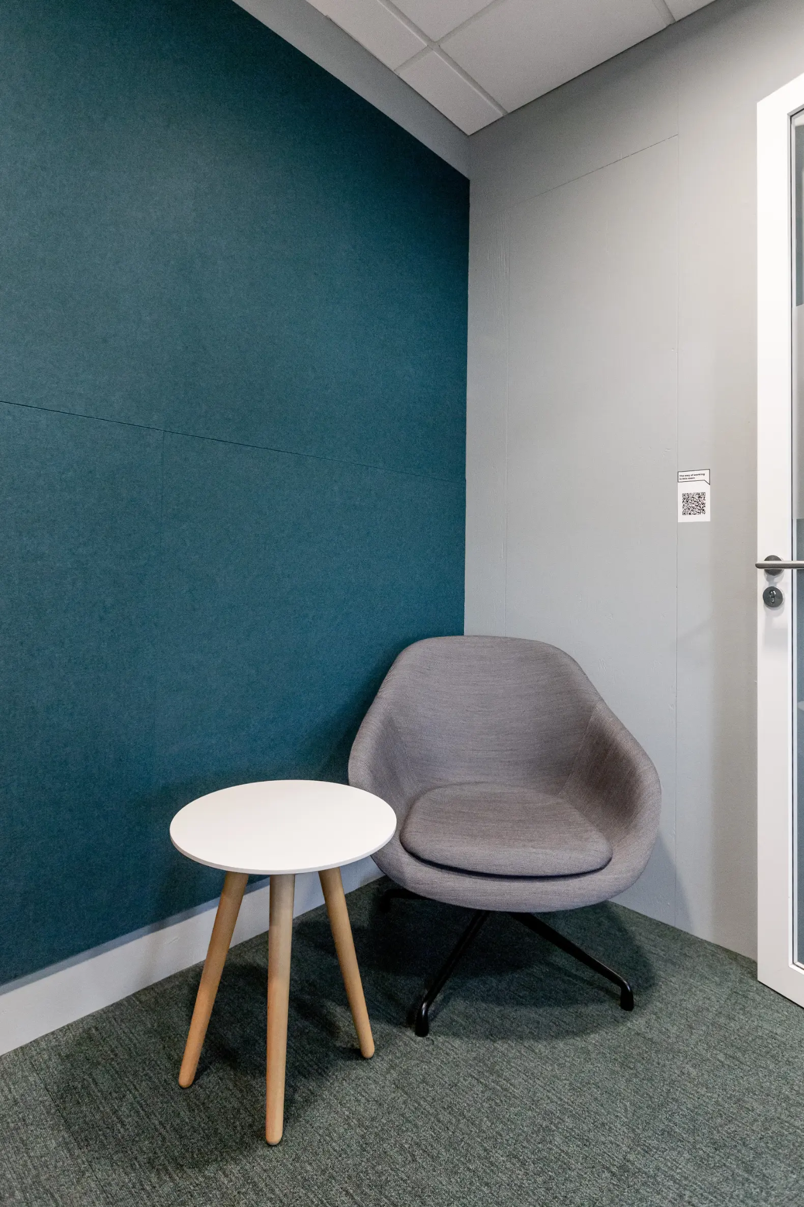 Voor een samenhangend geheel in uitstraling en akoestiek zijn de Acoustic PET Felt Panels van ReFelt, in de Standaard en Melange variant, door het hele kantoor toegepast. Ze zijn bevestigd aan wanden, geïntegreerd in focusplekken en gebruikt als werkplekverdelers, waardoor zowel visuele rust als geluidsreductie wordt geboden. Bestaand meubilair is waar mogelijk hergebruikt, wat aansluit bij de praktische en de zorgvuldige ontwerpaanpak. Het resultaat is een duurzame en uitnodigende werkomgeving die meebeweegt met de manier waarop mensen vandaag de dag werken.