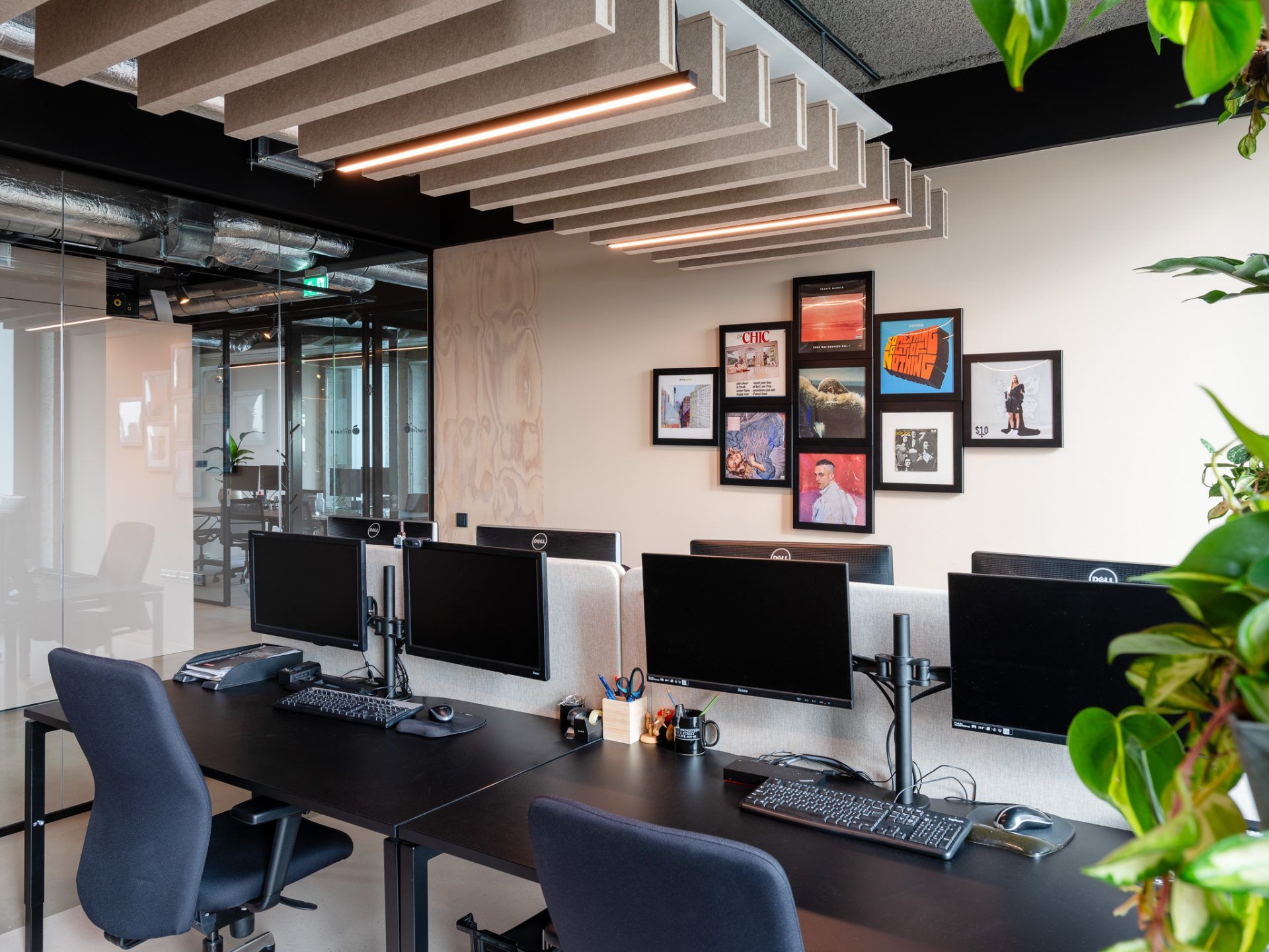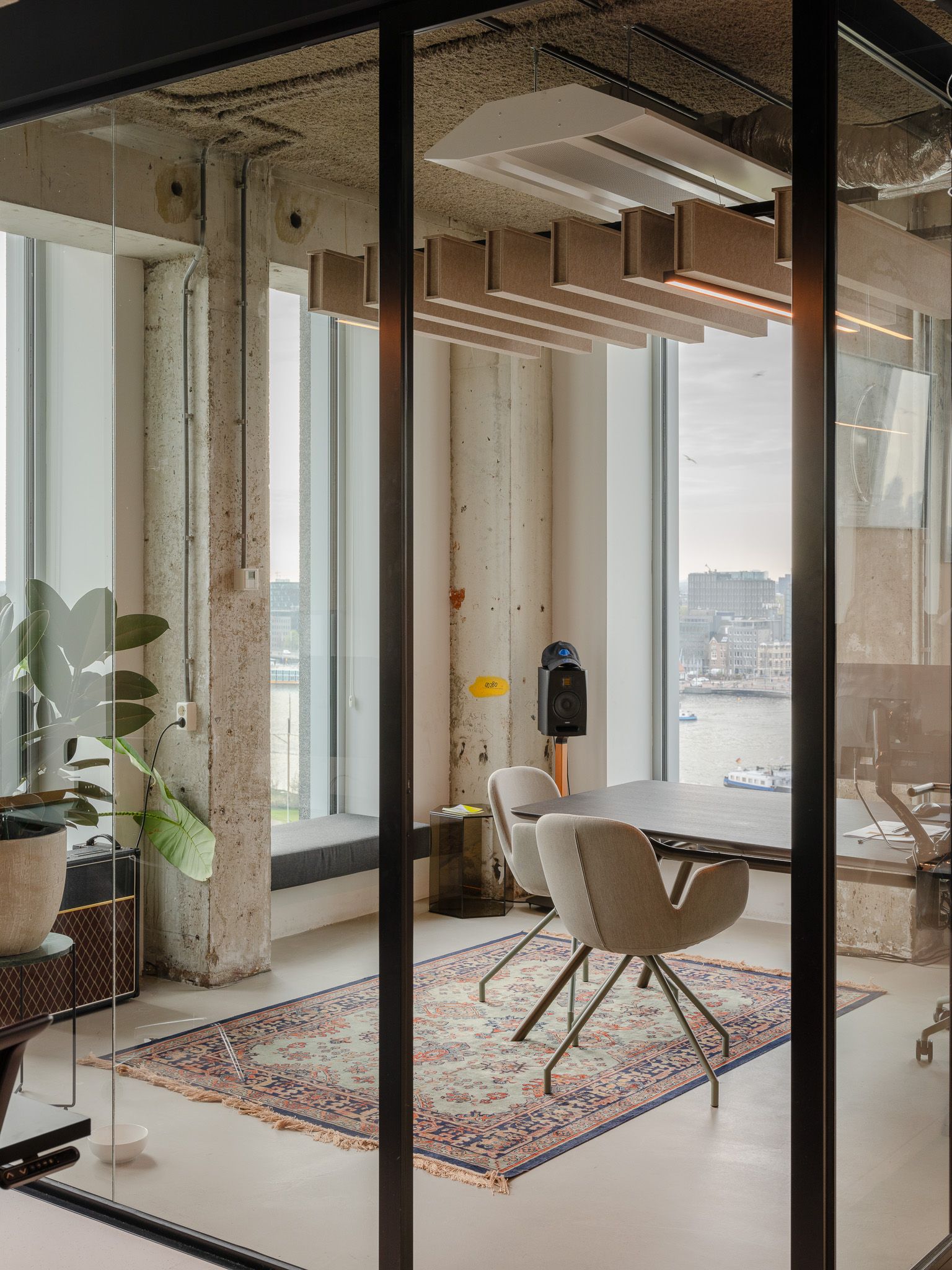 Het ontwerp brengt een doordachte balans tussen de krachtige structuur van het gebouw en een warme, tactiele sfeer. Huiskamerachtige zones geven het open kantoor een ontspannen en huiselijke uitstraling en nodigen uit tot informeel samenwerken. Zachte kleuren, warme materialen en weelderige beplanting verzachten het zichtbare beton en staal. Akoestisch comfort speelde een belangrijke rol in het ontwerp. Door de hele ruimte zijn ReFelt’s Dubbele Akoestische Baffles in de kleur Sand toegepast om geluid te dempen en samenhang te creëren. In de studio’s zorgen Streets V-Cut Akoestische Panelen in Cinnamon en Dark Grey voor akoestische verfijning en visuele structuur.
