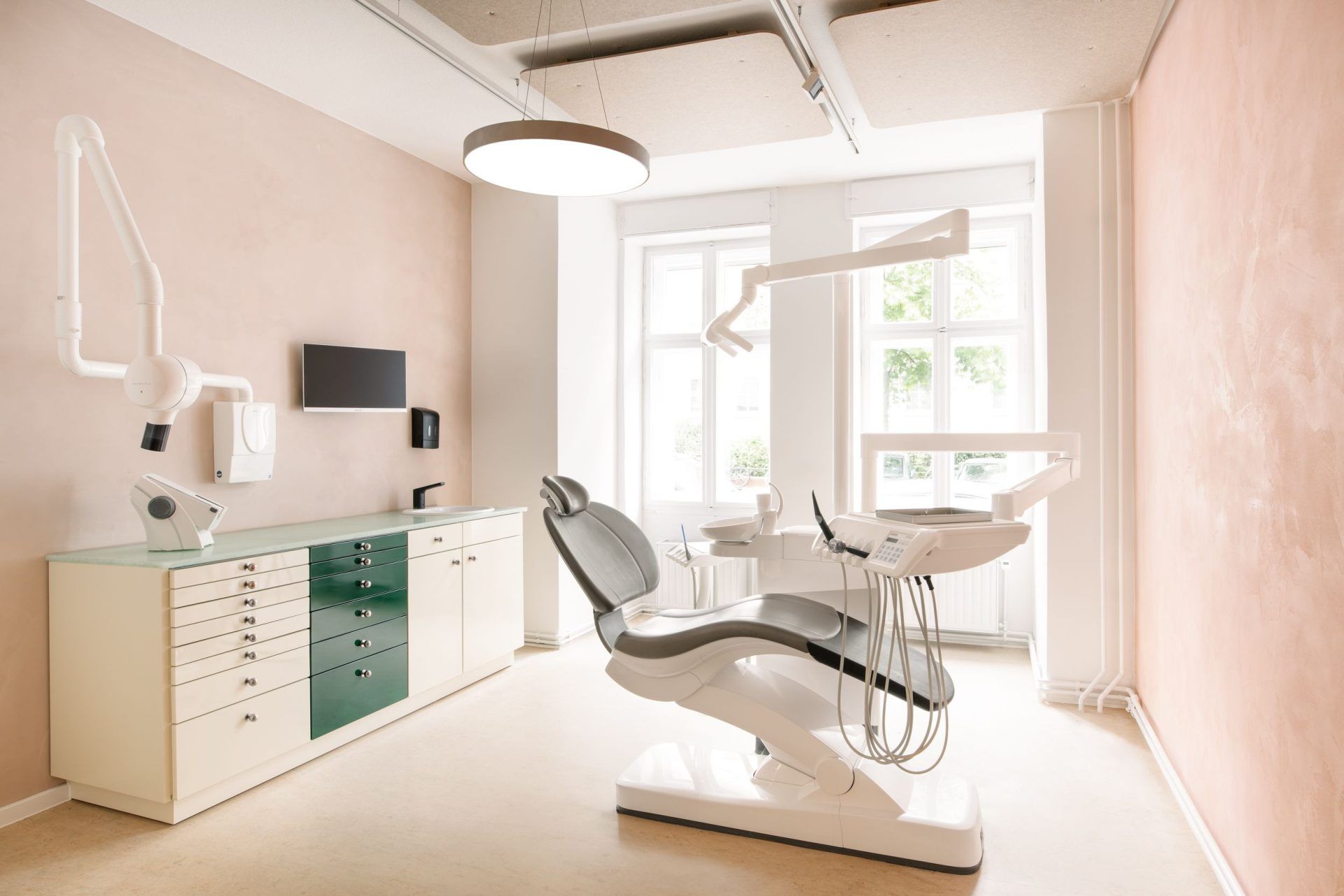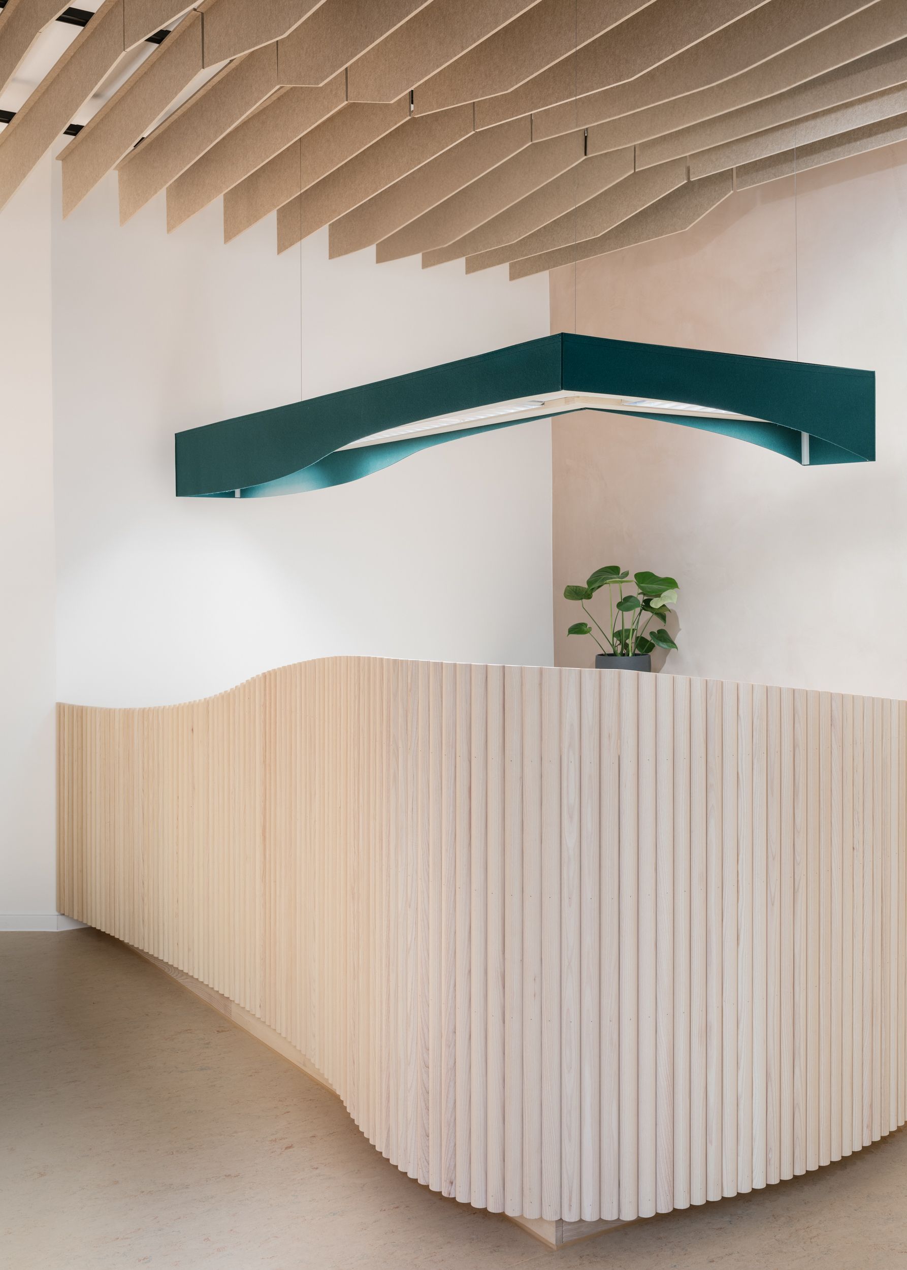 De ruimtes van de praktijk ademen een kalme sfeer uit door het gebruik van natuurlijke kleuren en materialen. Massief houten meubels verbinden de bezoekers op een organische manier met de omgeving. ReFelts Akoestische Baffles PET Felt Angular sieren de plafonds en dragen bij aan het zachte en uitnodigende ontwerp van de tandartsenpraktijk.