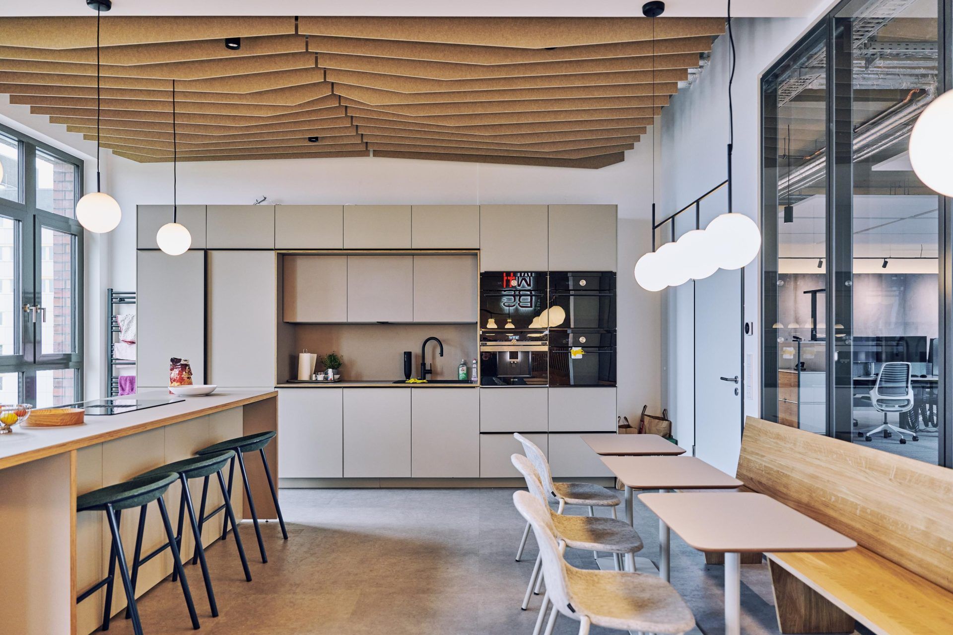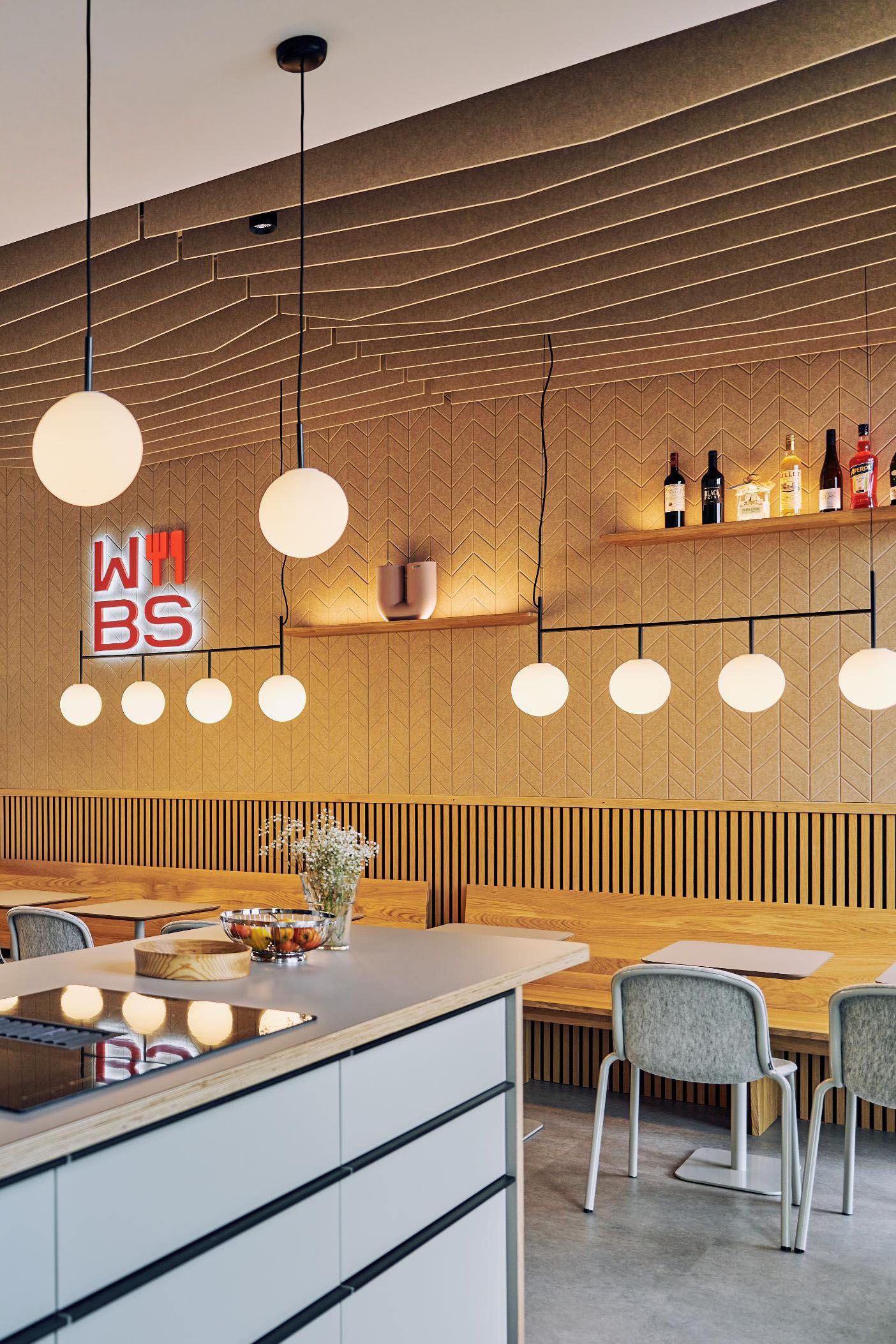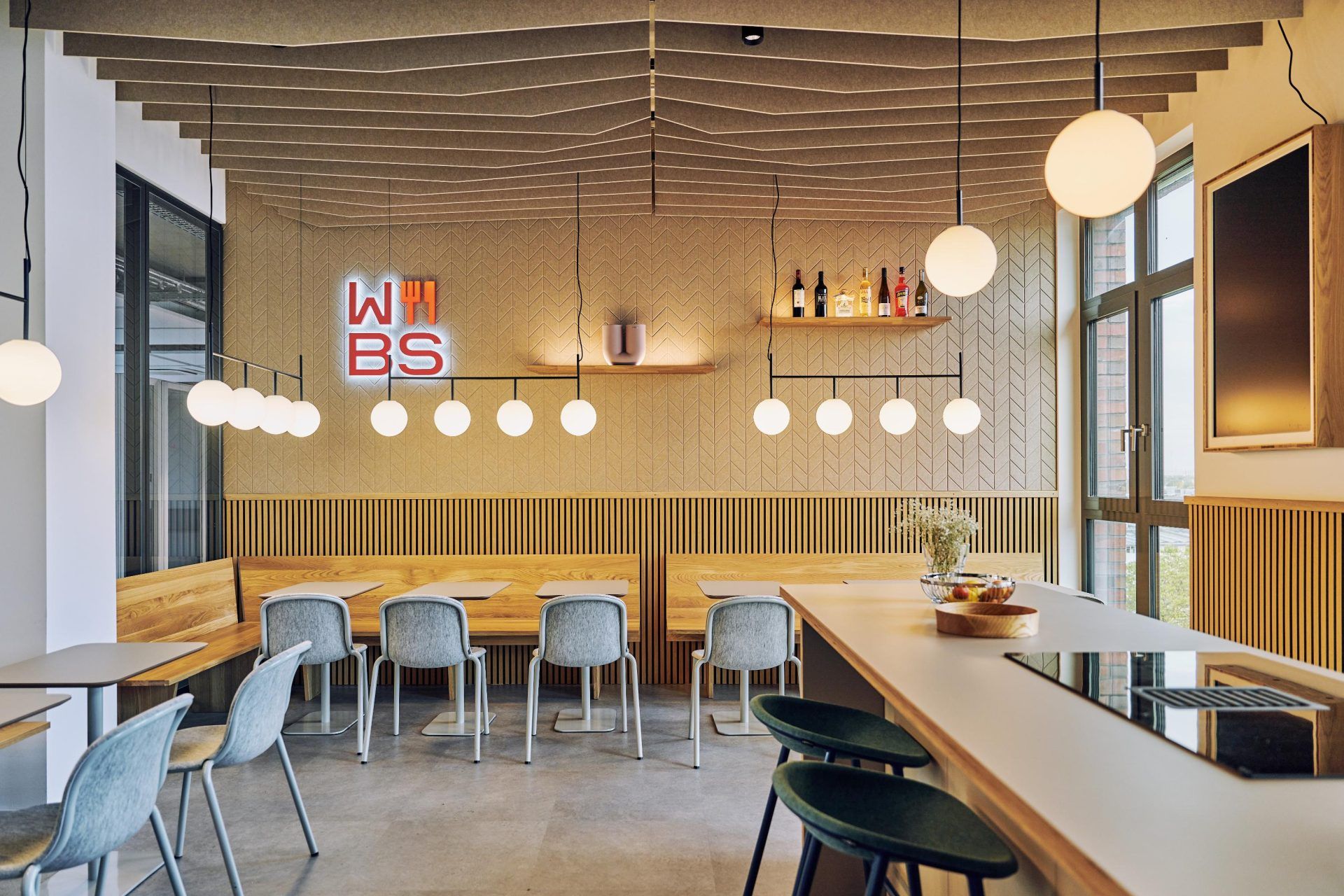 In de kantine speelt akoestiek een essentiële rol in de beleving van de ruimte. De sand kleurige Fishbone PET felt panelen van ReFelt zijn toegepast op de wanden en brengen structuur en rust, terwijl ze de akoestiek merkbaar verbeteren. Aan het plafond zorgen de Angular PET felt baffles voor een stille ritmiek die de ruimte visueel samenbrengt en galm dempt. Samen dragen deze elementen bij aan een werkomgeving waarin comfort en verbinding hand in hand gaan.