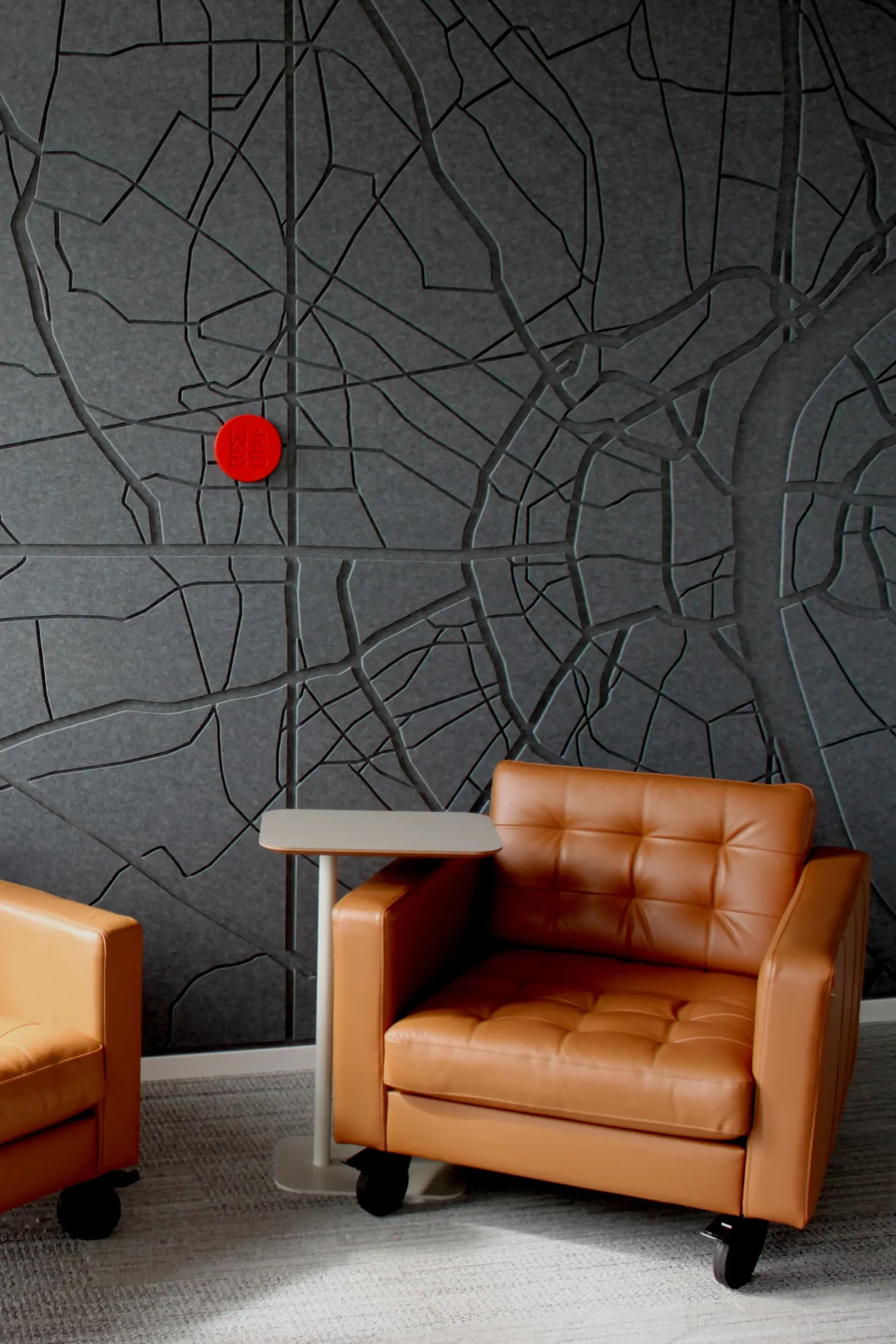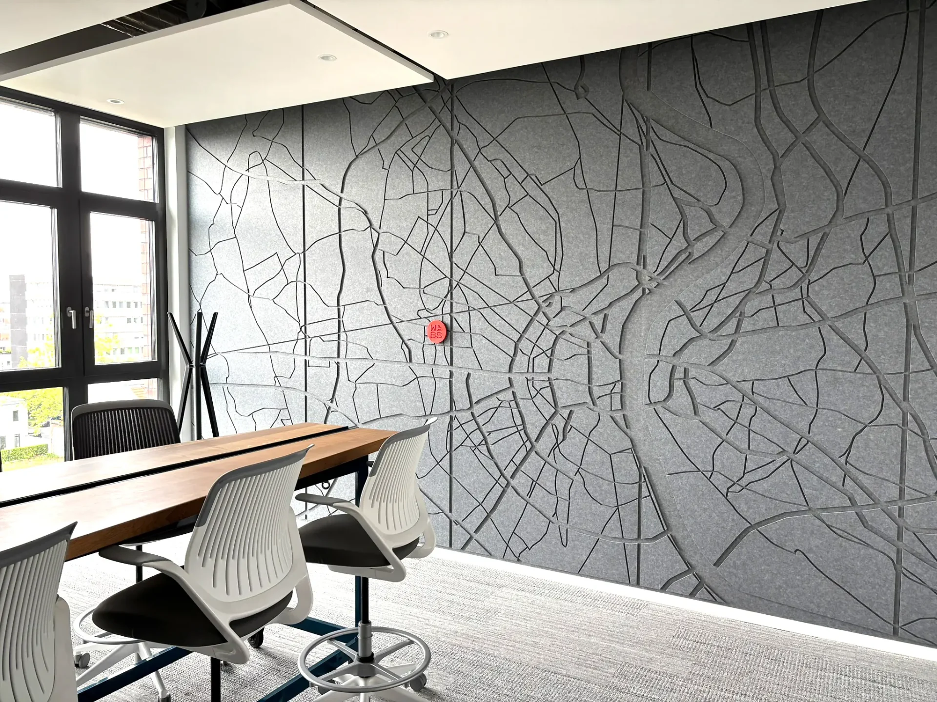 Een opvallend element in het kantoor is een op maat gemaakte akoestische wand met een stadskaart van Keulen, de thuisbasis van WBS.LEGAL. De wand is vervaardigd uit Light Grey PET Felt en voorzien van CNC-gesneden lijnen, wat zorgt voor reliëf en structuur én bijdraagt aan de akoestiek. Het ontwerp toont de stedelijke plattegrond op een subtiele, tastbare manier en bevat een rode markering die de locatie van het kantoor aanduidt. Zo ontstaat een lokale verwijzing in het interieur, die de werkplek op een rustige maar betekenisvolle manier verbindt met de omgeving.
