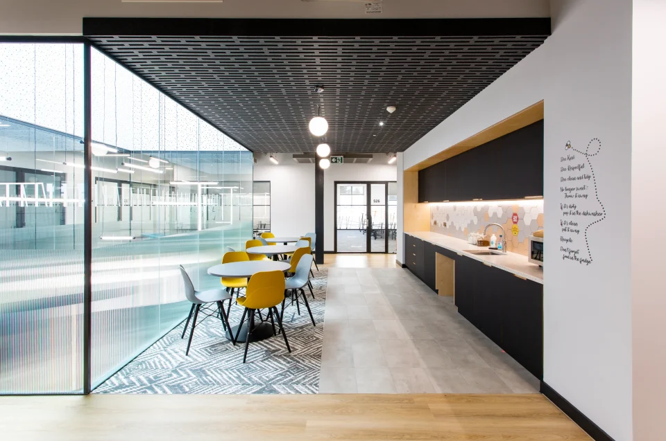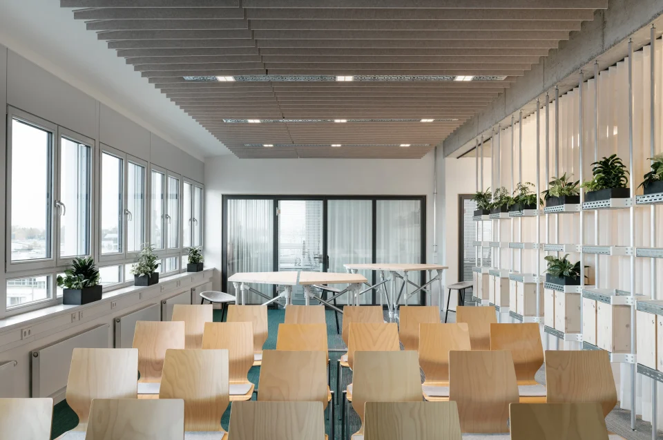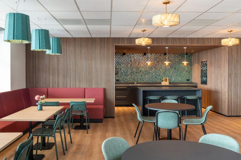 Een doordachte combinatie van wandpanelen en plafondoplossingen verbetert de akoestiek in de kantine en draagt bij aan een rustige ruimte waar comfort en verbinding centraal staan.