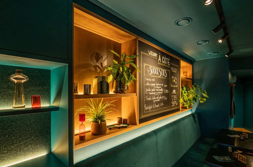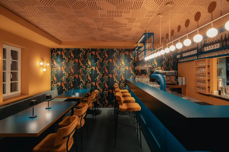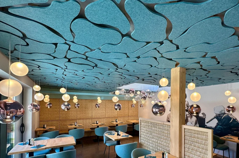 Een opvallend plafondontwerp met op maat gesneden PET Felt panelen versterkt de sfeer van dit restaurant.