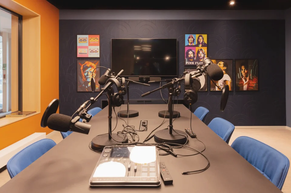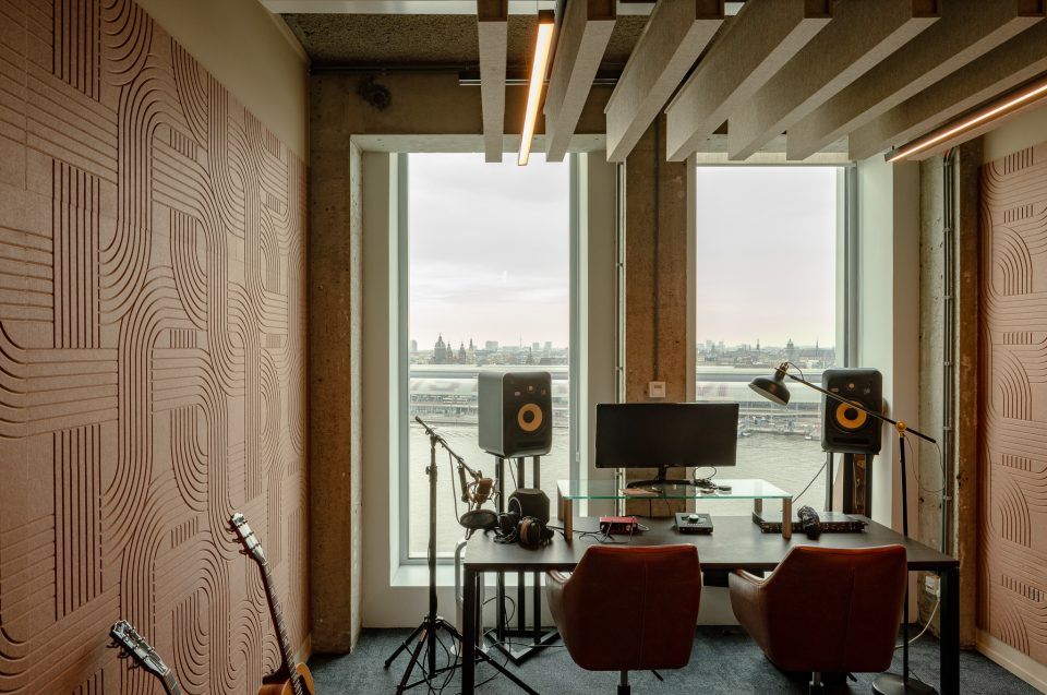 HNK Amsterdam Sloterdijk introduceert een nieuw flexibel kantoorconcept, het biedt duurzame samenwerkplekken en een moderne podcast studio die is uitgerust met akoestische panelen.