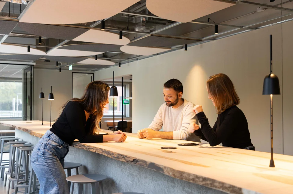 Flexibele en collaboratieve werkomgeving die hybride werken ondersteunt, met een combinatie van open ruimtes en stille zones voor focus en verbinding.