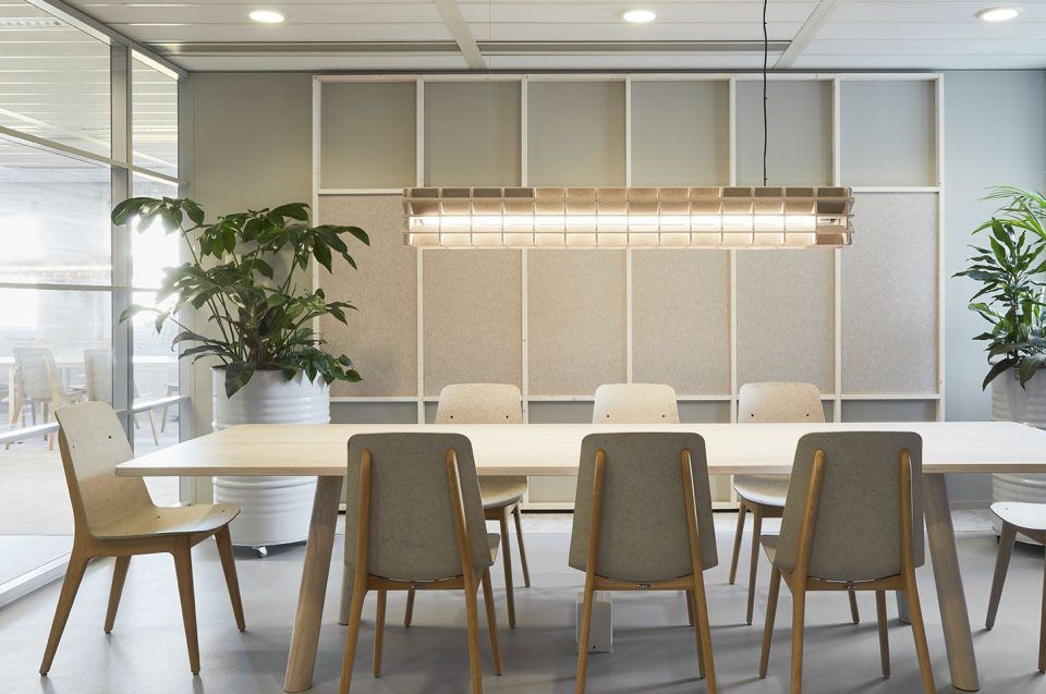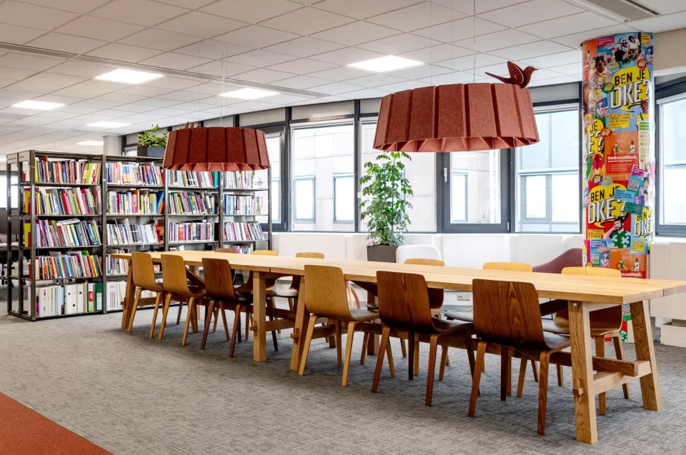 Rever Interieurprojecten ontwierp voor Sovib & Synthra in Rotterdam een inventieve omgeving met de Aster Pet Felt Acoustic Lamp in de open werkplekken en het café.
