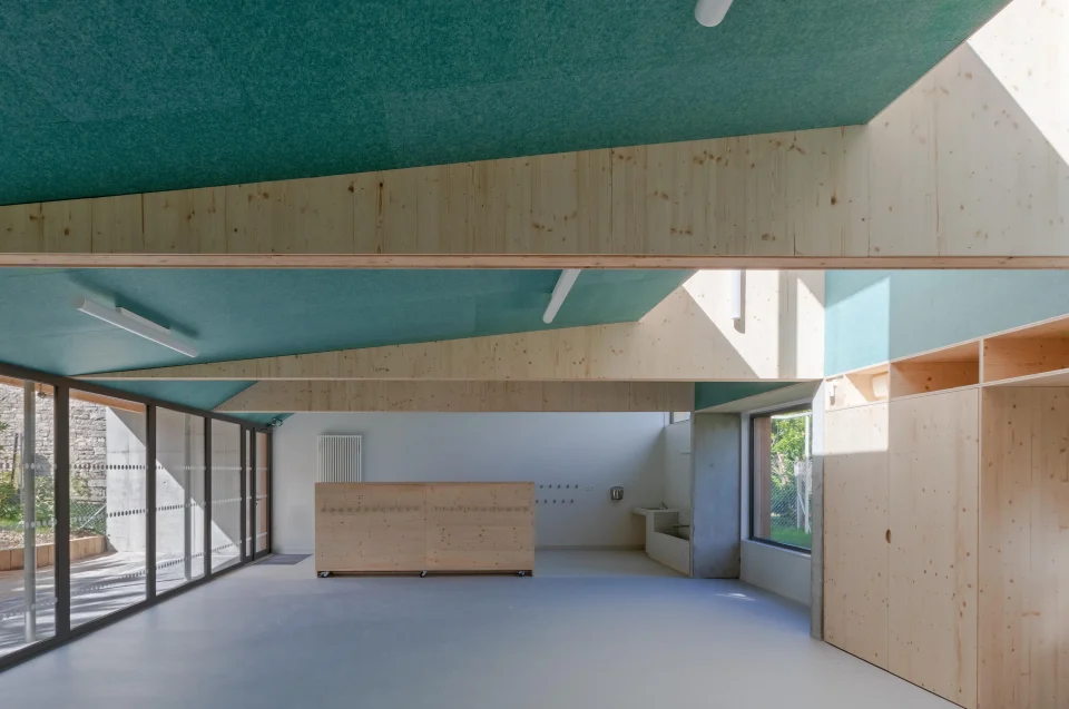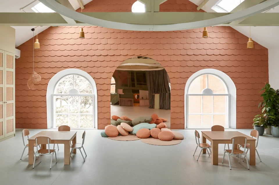 Een voormalige kerk is getransformeerd tot een Scandinavisch geïnspireerd kinderdagverblijf dat rust, warmte en functionaliteit uitstraalt.