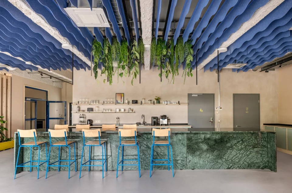 D/DOCK ontwierp een kantoorruimte die biofiele elementen en duurzaamheidsinitiatieven combineert, waardoor een productieve en milieubewuste werkruimte ontstaat.