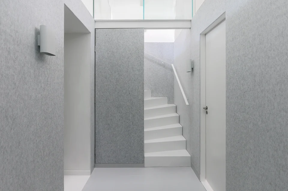 In dit minimalistische interieurontwerp heeft de architect akoestische panelen toegevoegd om de ruimte meer comfort en rust te geven.
