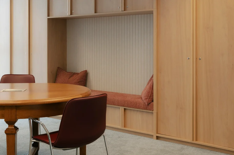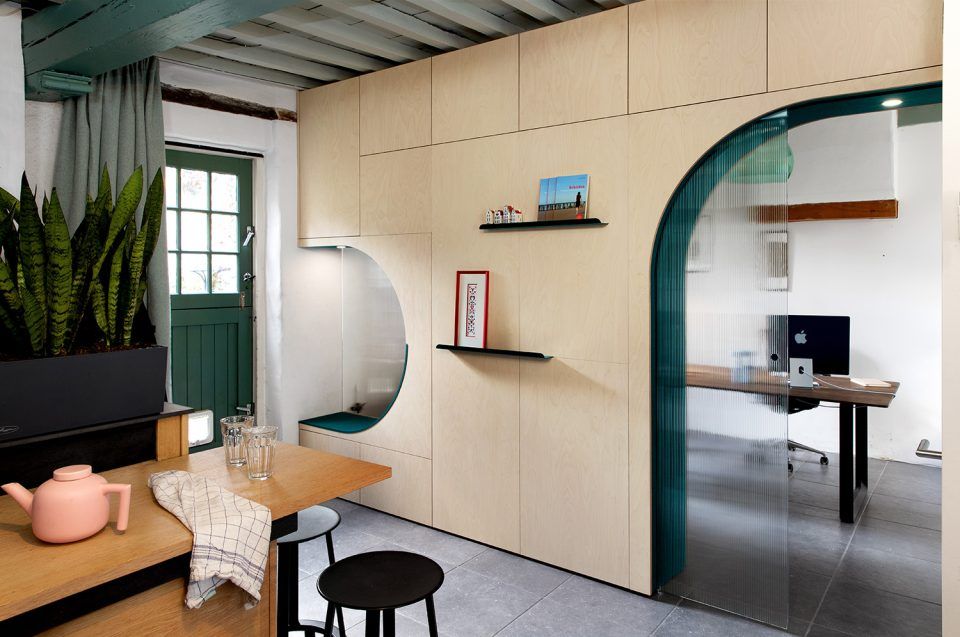Een roomdivider met ingebouwde opbergruimte, een zitnis en afgeronde afwerkingen van PET Felt creëert een open verbinding tussen de keuken en het kantoor.