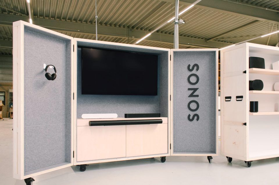 Mobiele demoboxen voor Sonos, ontworpen voor snelle opbouw en overtuigende presentaties voor op verschillende plekken.