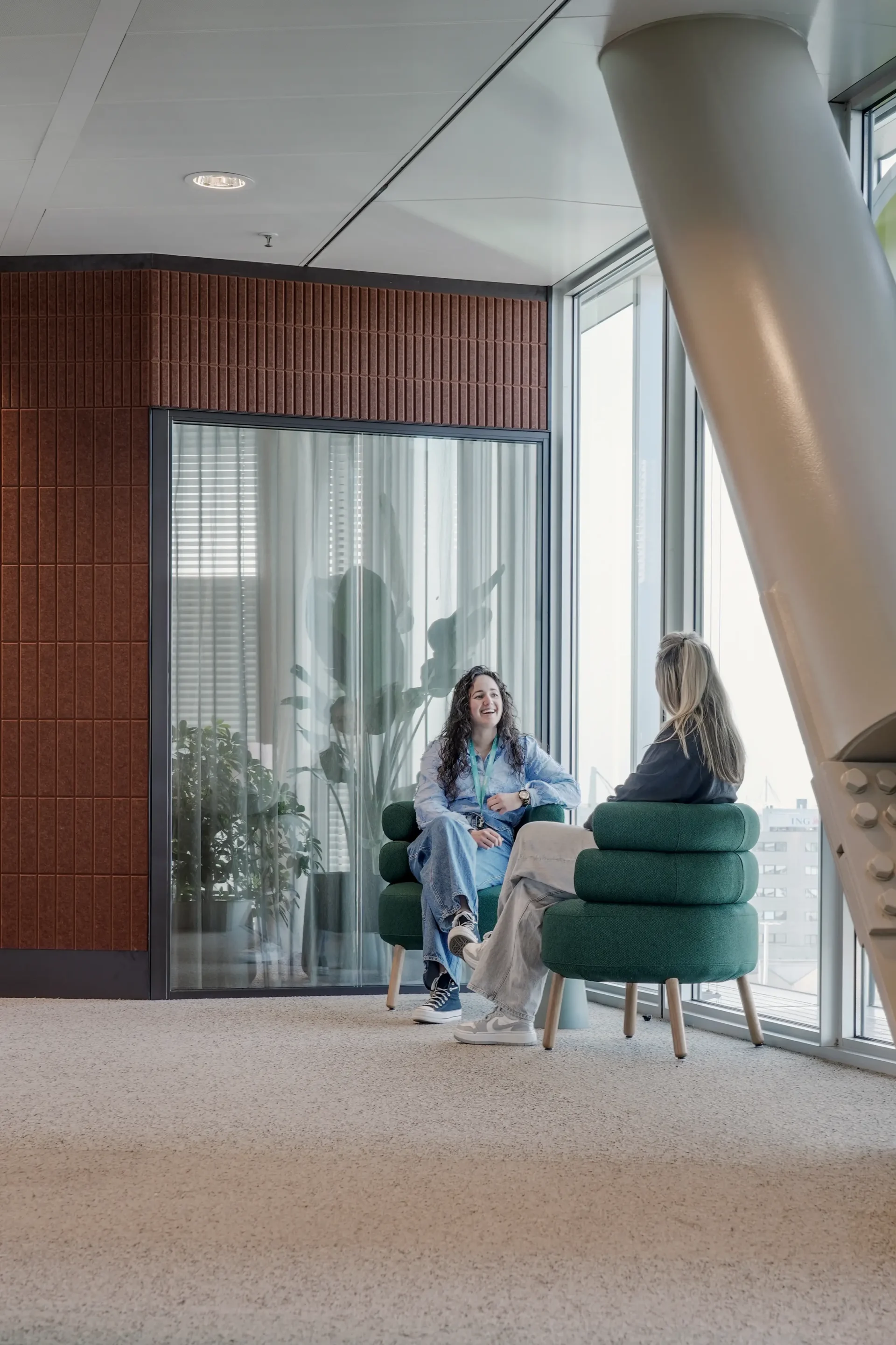 Each pavilion is clad in a brick-patterned finish using Acoustic PET Felt Panels in Coconut, creating the visual impression of small standalone buildings. This choice not only supports the campus atmosphere but also introduces a clever acoustic layer within the open space. With a soft texture that mimics stone, the panels bring warmth and tactility while absorbing sound. The panels were custom-cut in a grid motif that echoes the architectural language of the building. This recurring pattern extends into the structural beams and climate ceilings, creating a cohesive interior design.