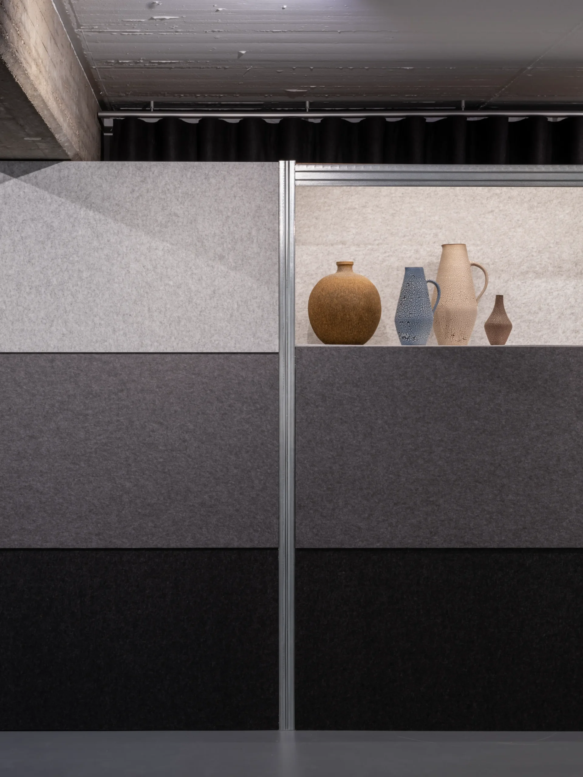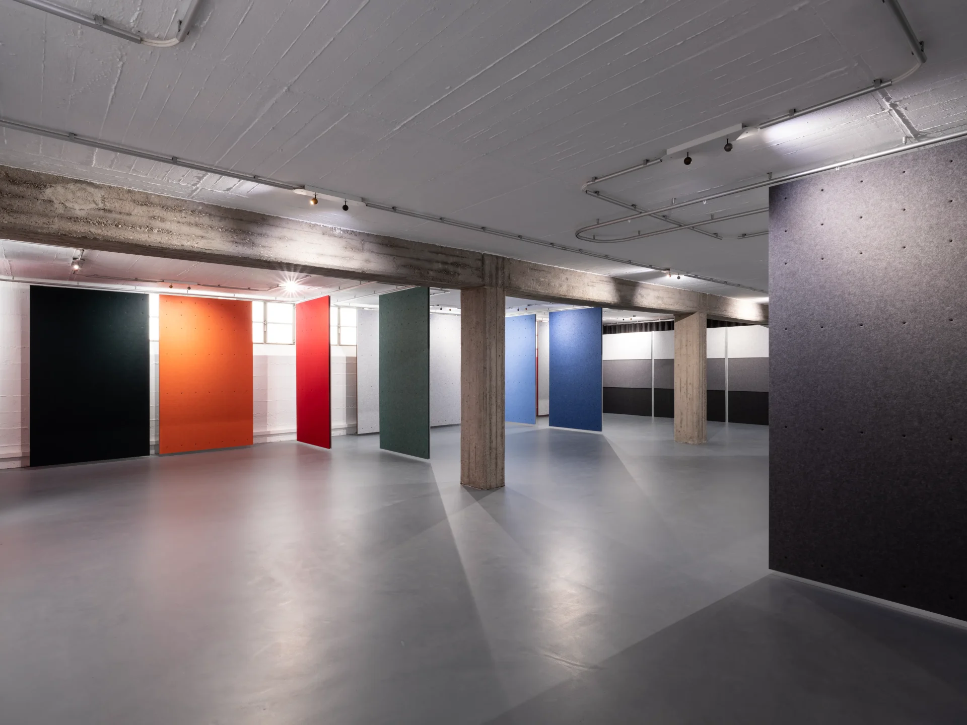 Galerie Sammlung Amann distinguishes itself by its unique use of space. Part of the gallery is ingeniously situated within the architectural office of no w here / architekten designer, co-founded by Karl Amann and Henning Volpp. This innovative integration allows the gallery to utilize the architectural office’s space, located in the basement of Schwabstraße 69/1, for its exhibitions. The space is equipped with a sophisticated system of tubes on the ceiling, enabling the flexible arrangement of display panels made from recycled PET material. This system offers endless possibilities for artists to create diverse spatial situations and color combinations, making each exhibition a unique experience.