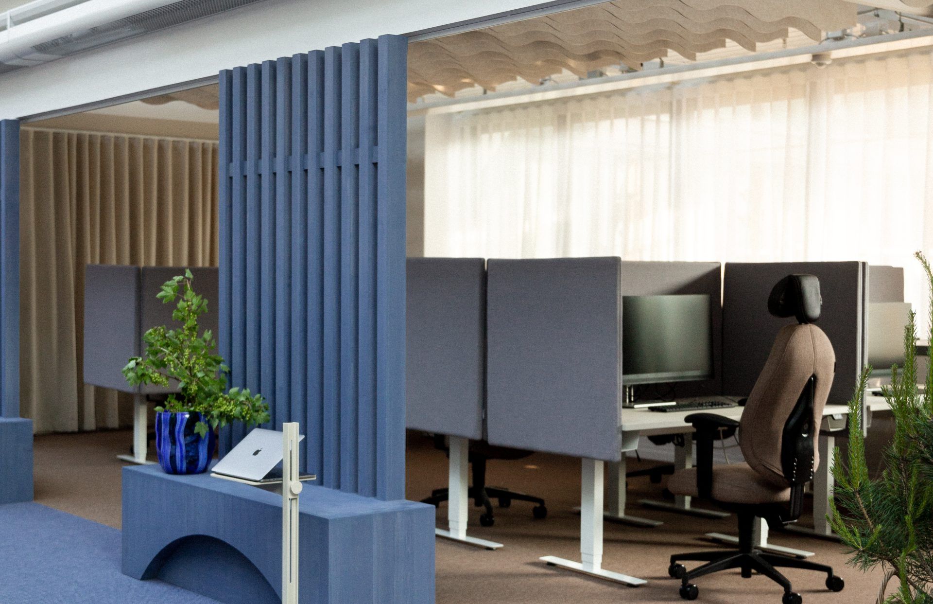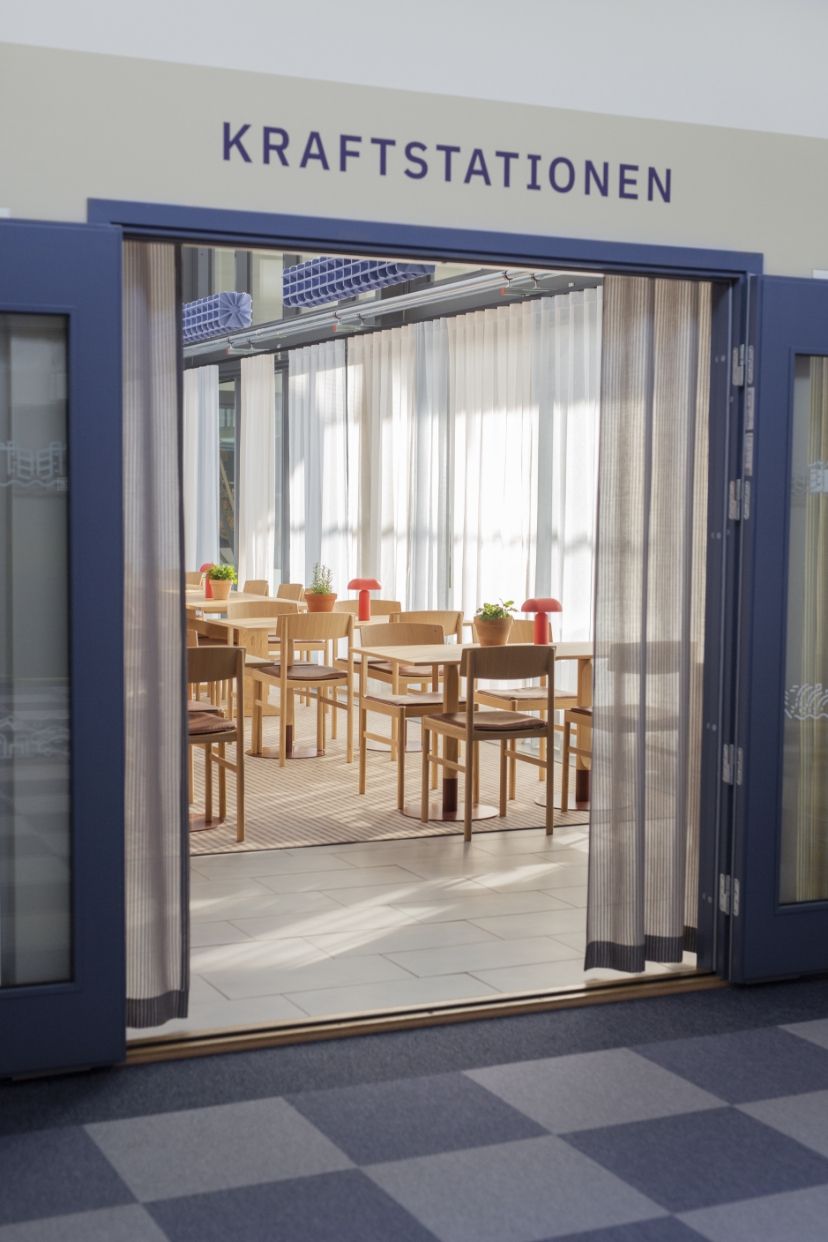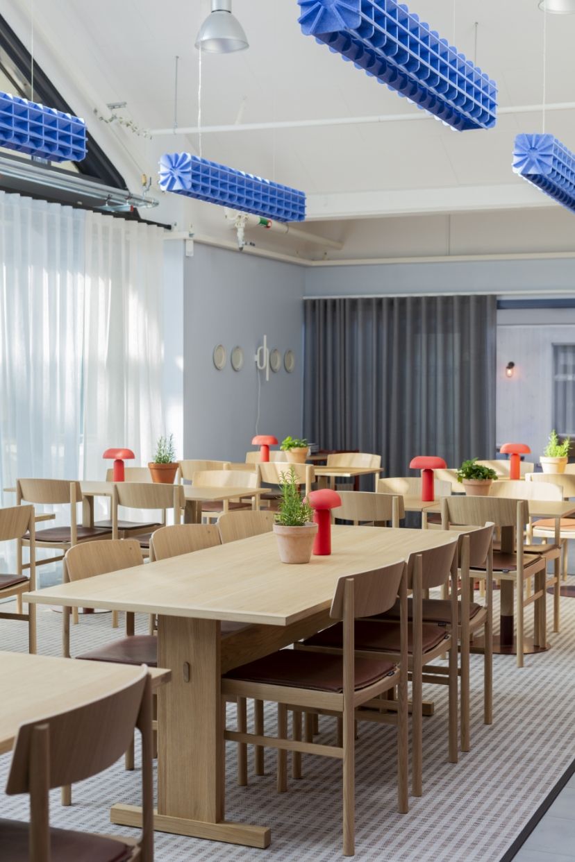 This former factory for locomotives and water turbines has been transformed by Plats! designbyrå into a contemporary workspace. The 80-metre open hall preserves its industrial bones while pine wood, natural materials, and textiles add warmth. Blue accents flow through the space like canal waters, from the waterfall-inspired stepped seating to the wave-patterned guest lounge.