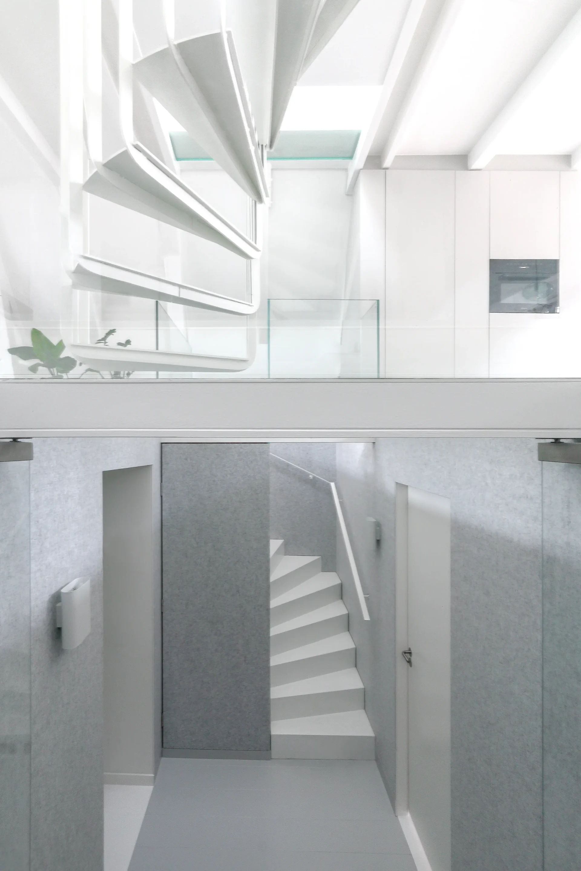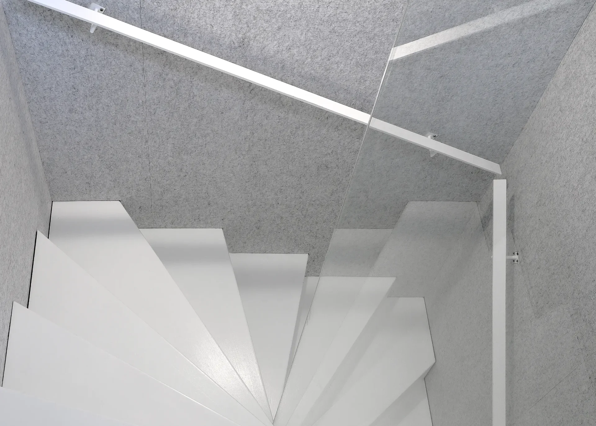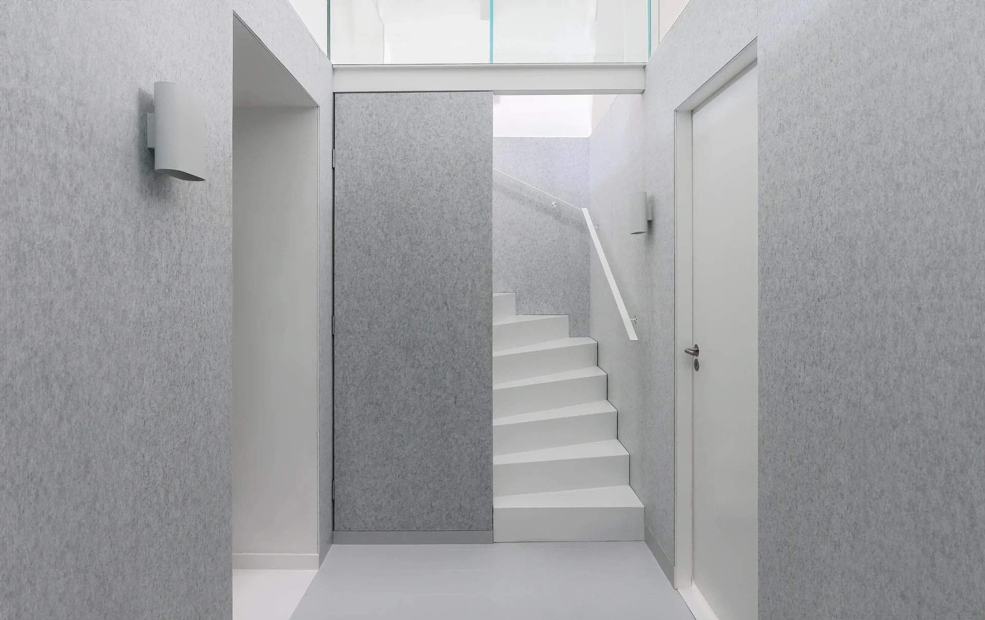 The walls of the entrance hall are lined with acoustic PET felt panels, providing additional acoustic comfort as soon as you enter from the busy city centre. These panels, made from recycled PET bottles, help to create a quieter, more peaceful atmosphere inside the home. Their soft texture and light grey colour blend seamlessly into the minimalist design, adding both acoustic comfort and a subtle visual touch to the space.