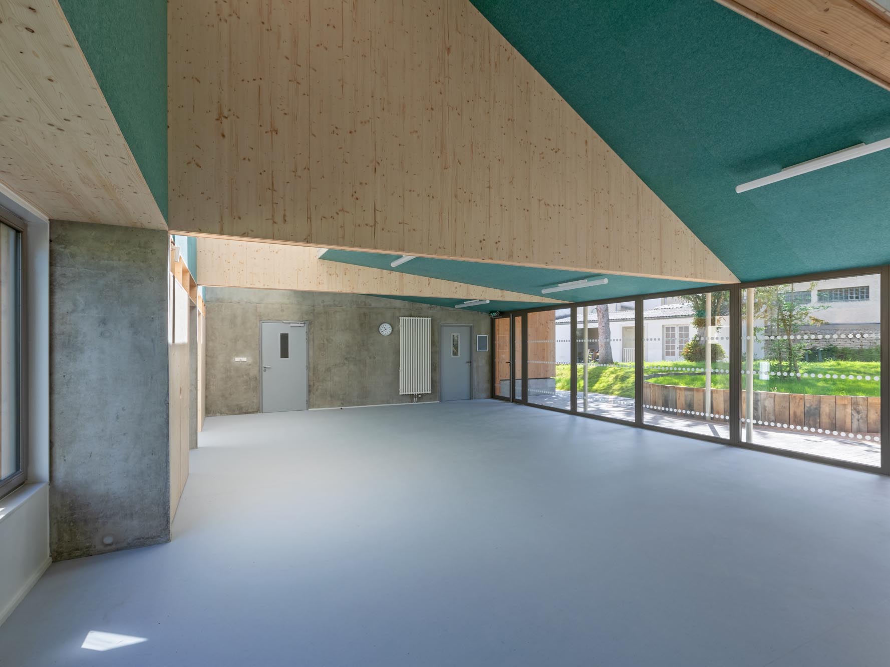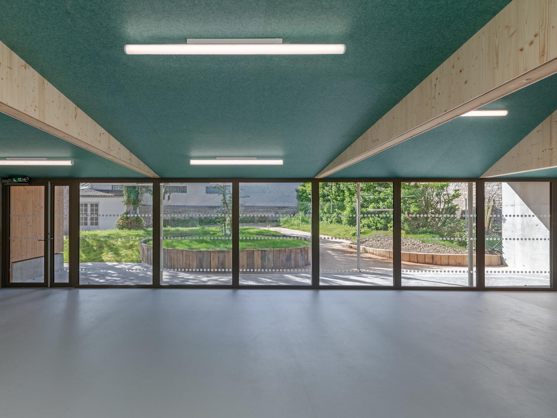 The construction of this school restaurant in Demigny highlights sustainable design and community integration. The building features extensive use of natural light and materials, creating a welcoming and healthy environment. Large windows offer views of the surrounding garden, creating a seamless connection between the indoors and outdoors. Notably, the ceilings are lined with Acoustic PET Felt Panels, which enhance acoustic comfort and contribute to the project’s sustainability. Additionally, the project includes a vegetable garden, providing a functional and educational space for students.
