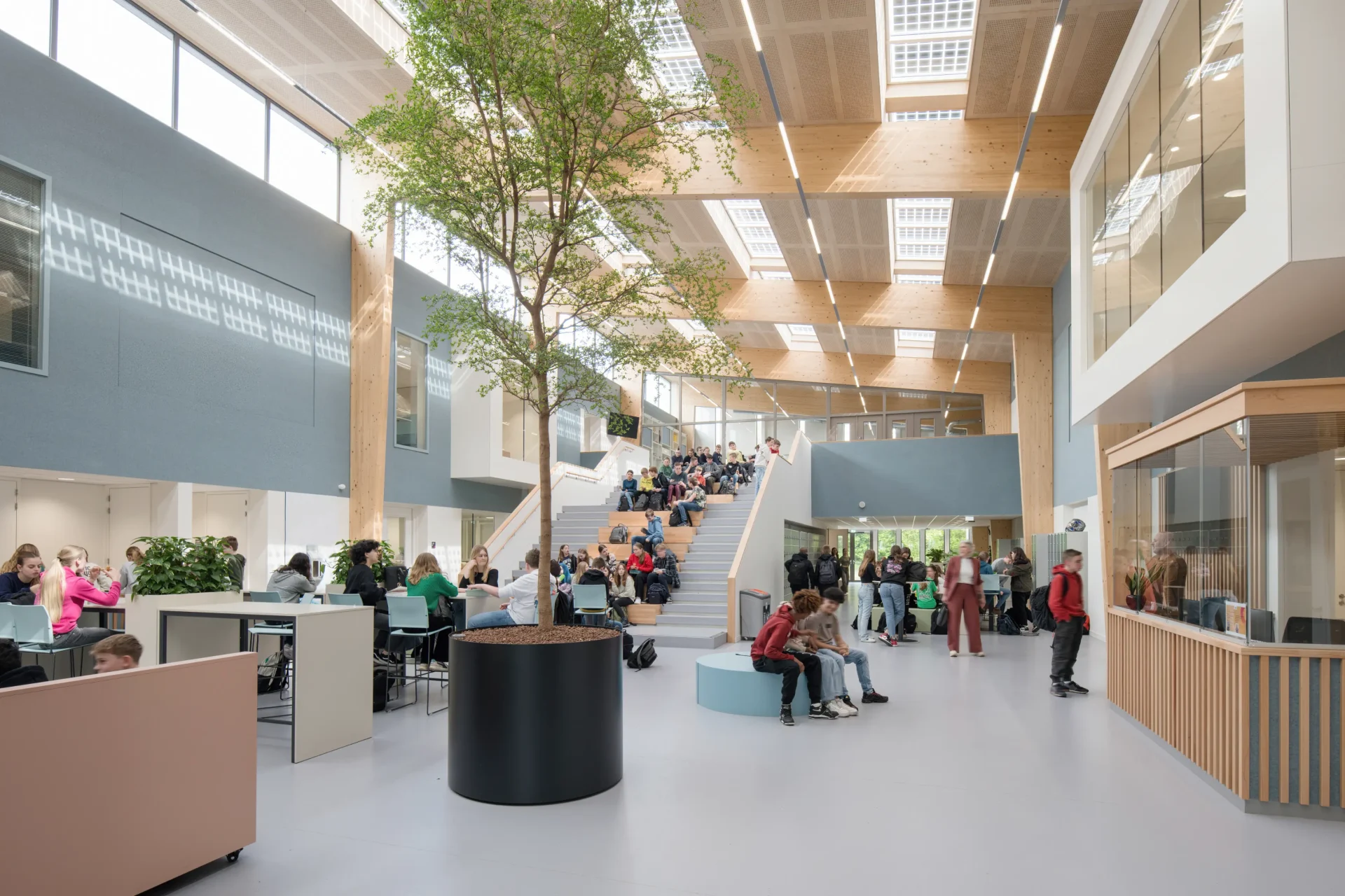 The new Staring College building was designed to accommodate a variety of educational programs for over 320 students. With clusters dedicated to subjects such as technology, healthcare, hospitality, and entrepreneurship, the building creates a well-organised and functional learning environment. Sustainability was a central focus during the design process, guiding the careful selection of materials to meet both functional and environmental goals. As part of this approach, 12mm Melange Acoustic PET Felt Panels were installed along the upper walls to enhance acoustic comfort and complement the building’s modern design.